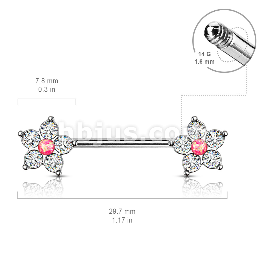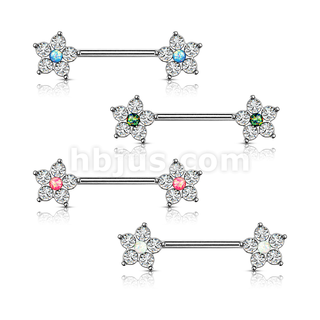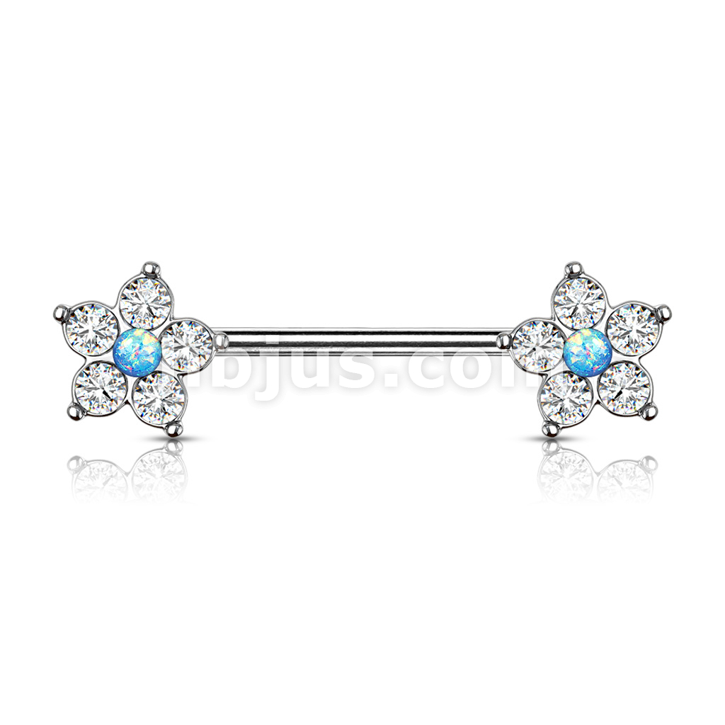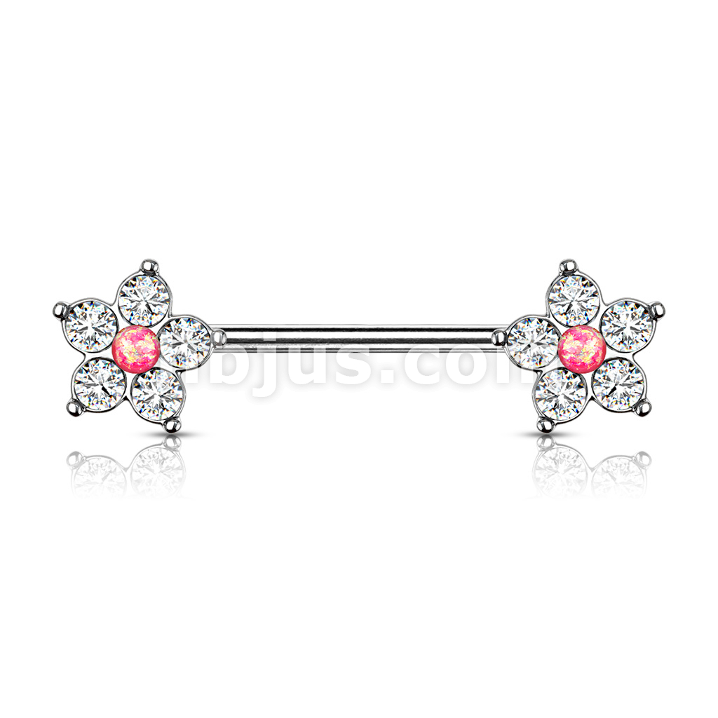 5 CZ Flower with Opal Glitter Center 316L Surgical Steel Nipple Barbell Rings
