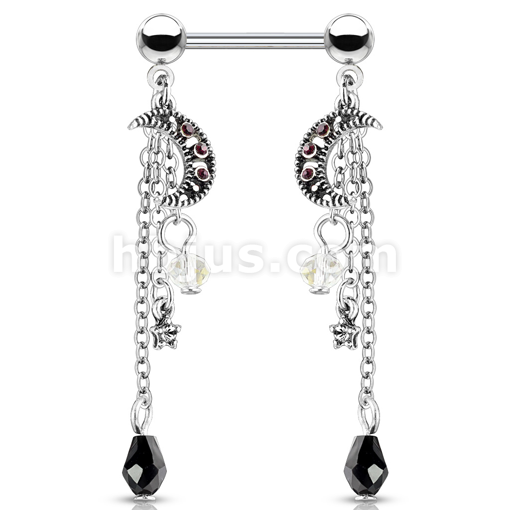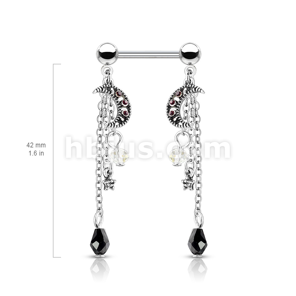 CZ Set Antique Silver Plated Moon with CZ Center Antique Silver Plated Star and Faceted Beads Chain Dangle 316L Surgical Steel Nipple Barbell Rings