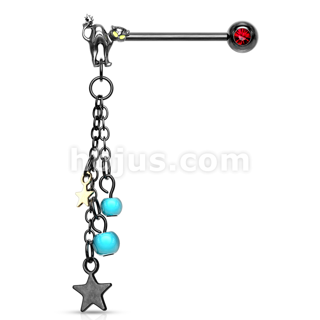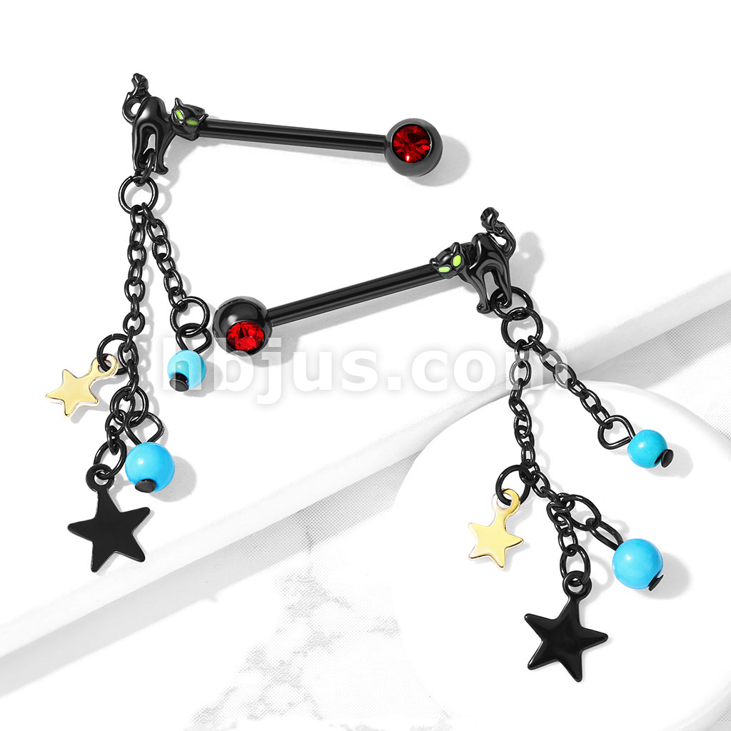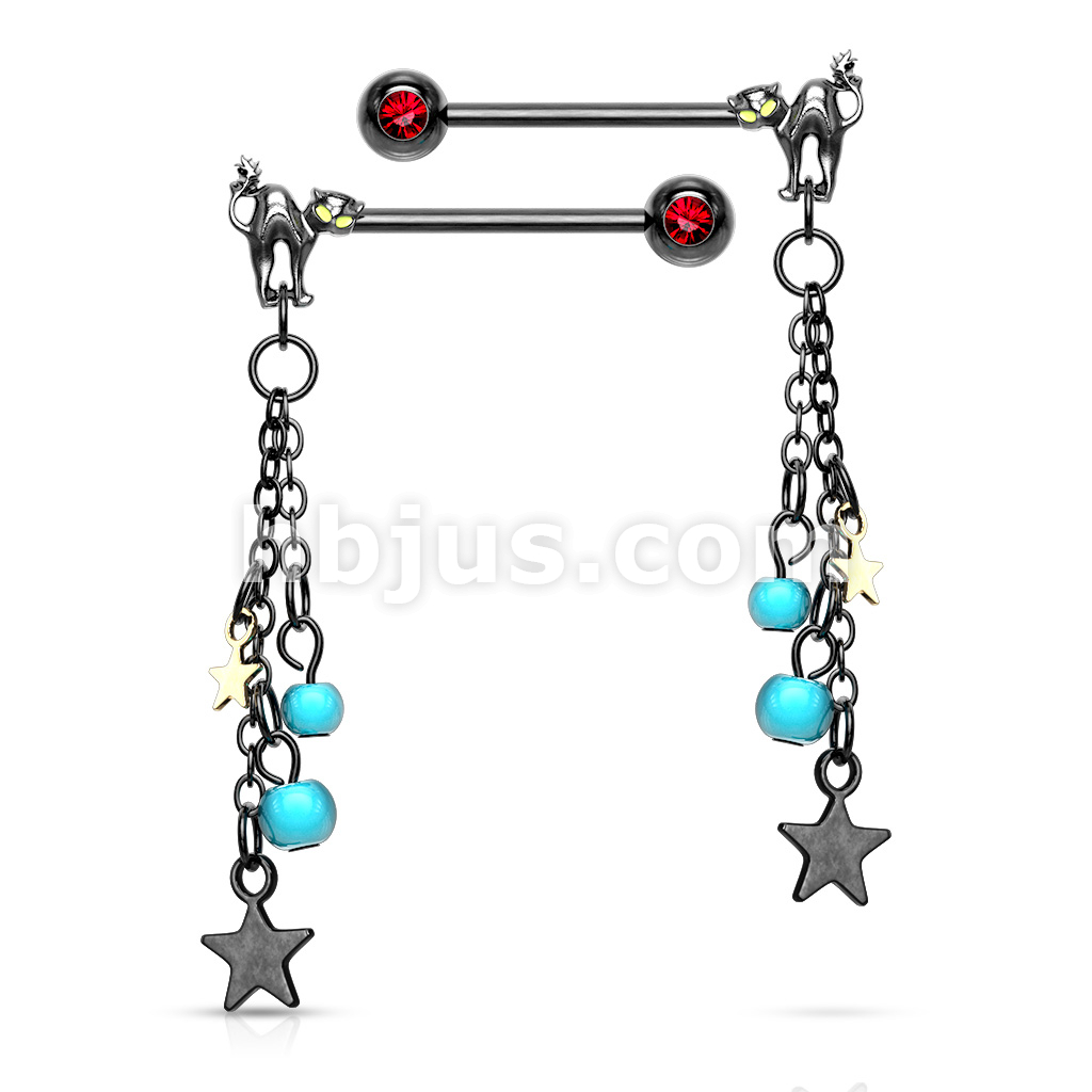 Pair of Cat with Turquoise Beads and Star Dangle with Red Gemmed Set End 316L Surgical Steel Nipple Barbell Rings