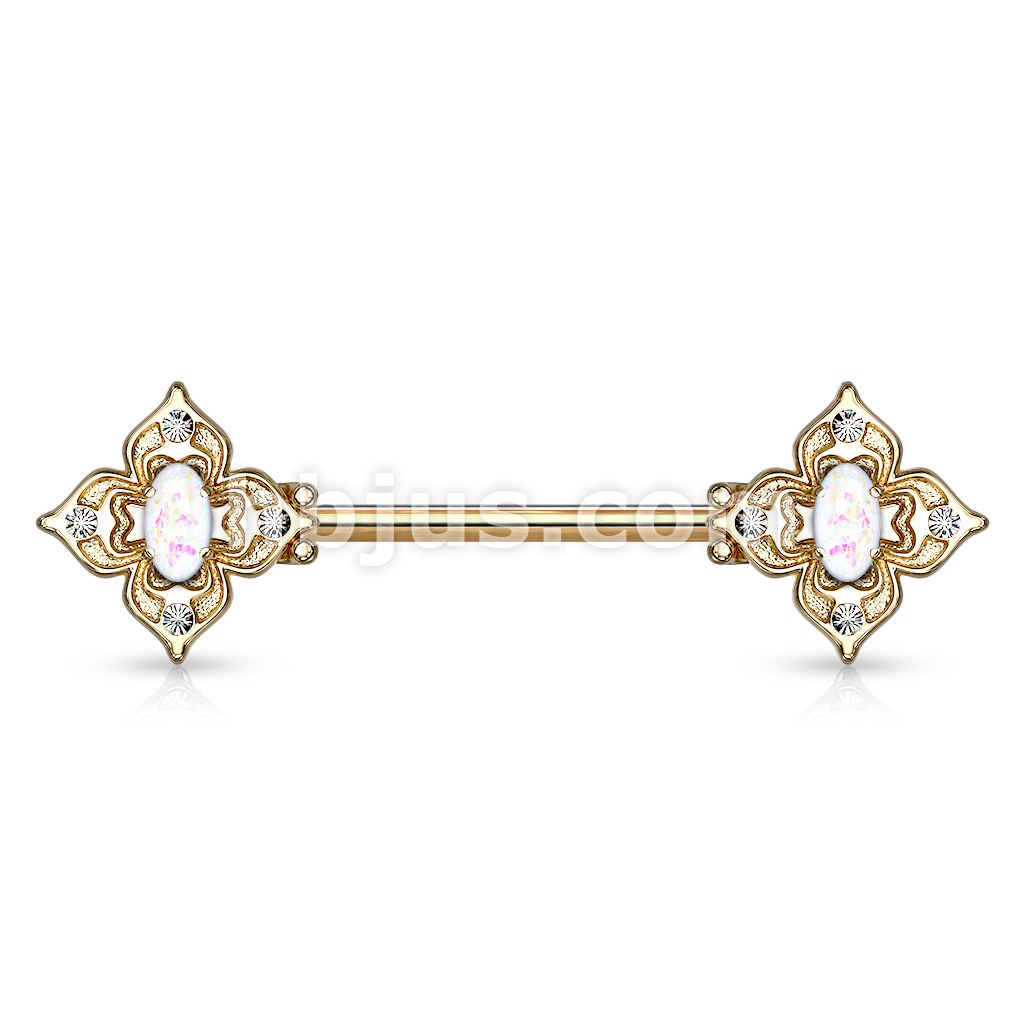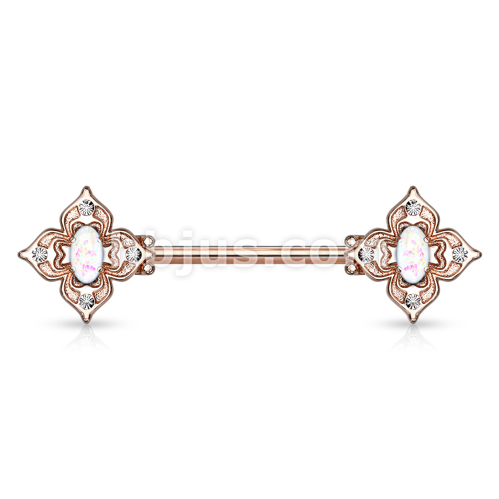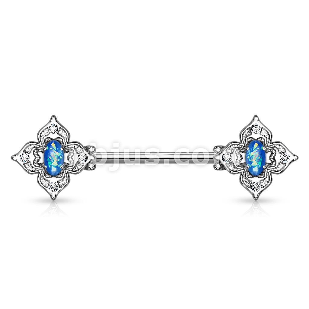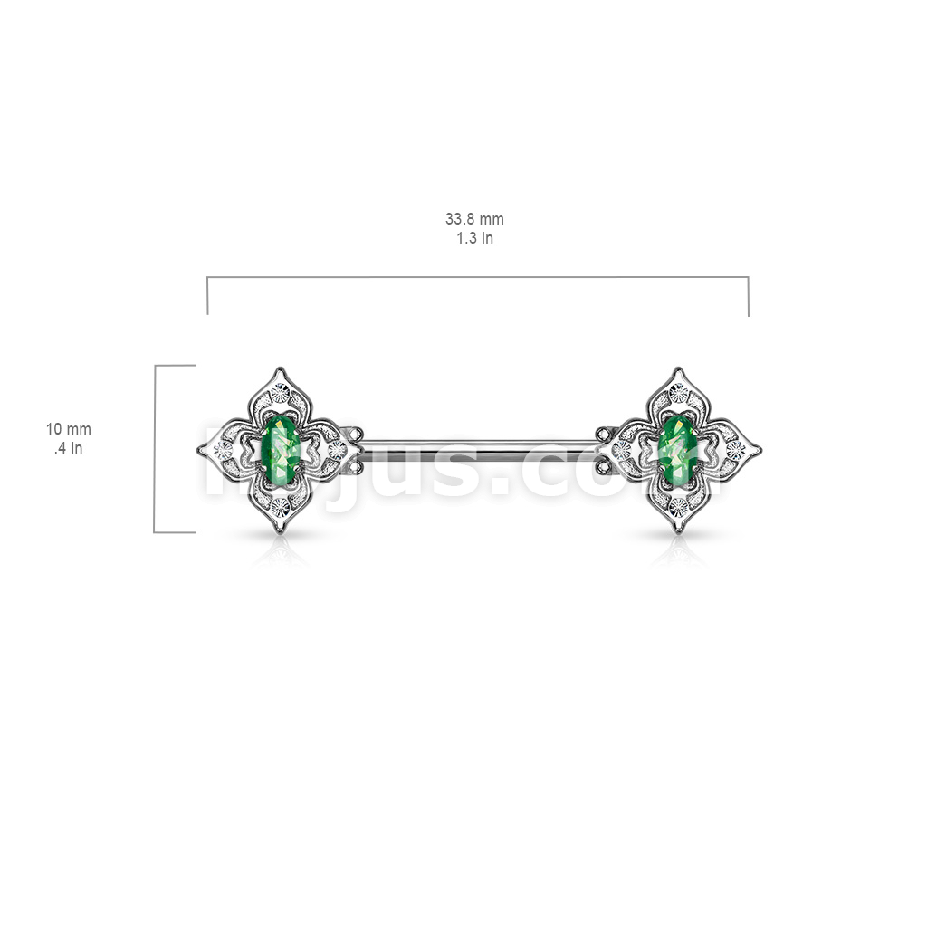 Floral Filigree Square With Crystal Accents and Opal Glitter Center 316L Surgical Steel Nipple Barbell Rings