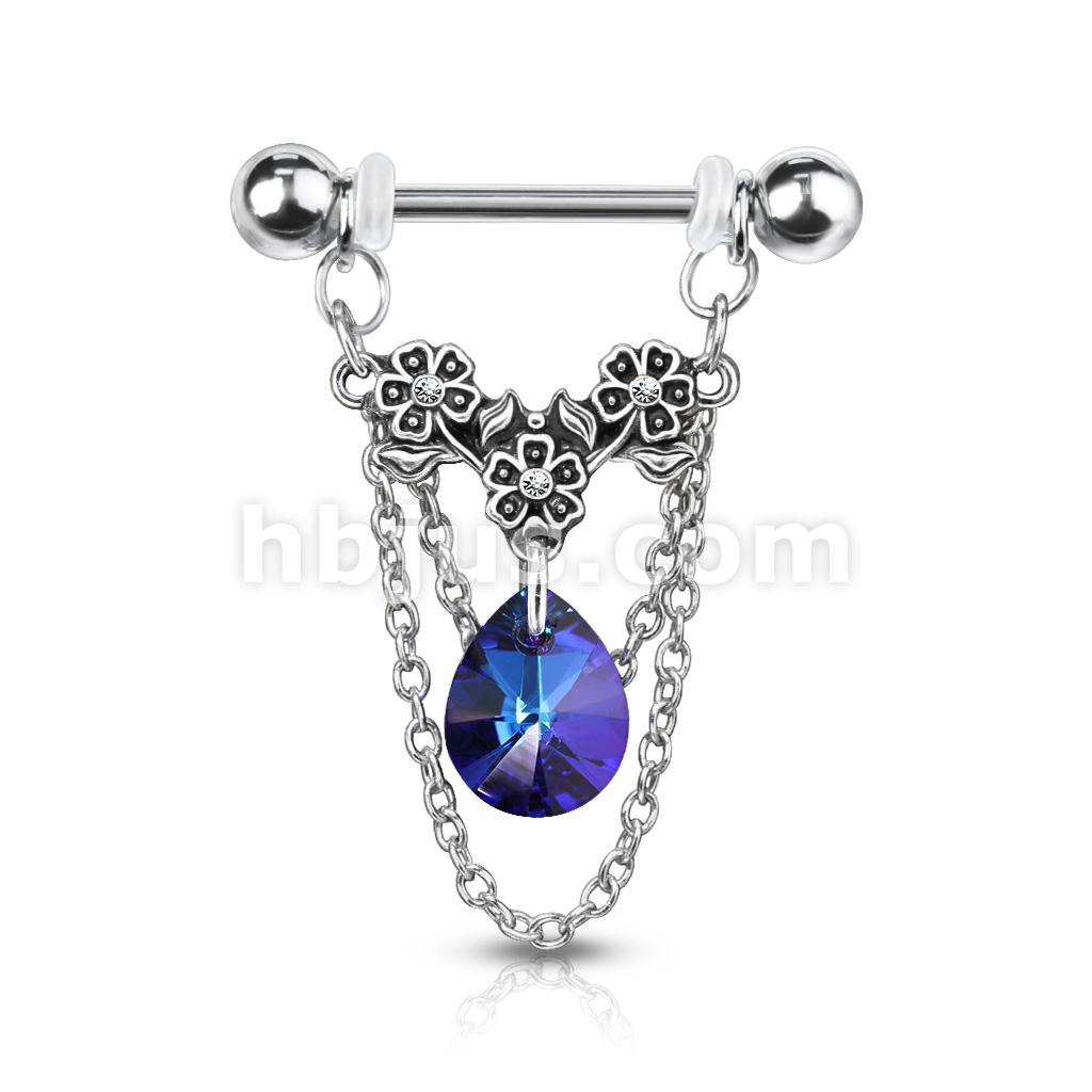 Triple Crystal Center Flower with Pear Crystal and Chains Dangle 316L Surgical Steel Nipple Barbell Rings