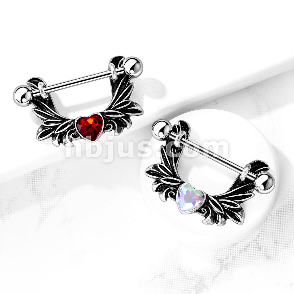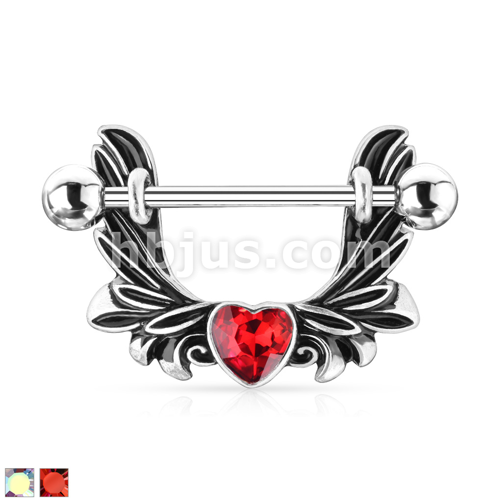 Angel Wings With Heart-Centered Crystal 316L Surgical Steel Nipple Shield Ring