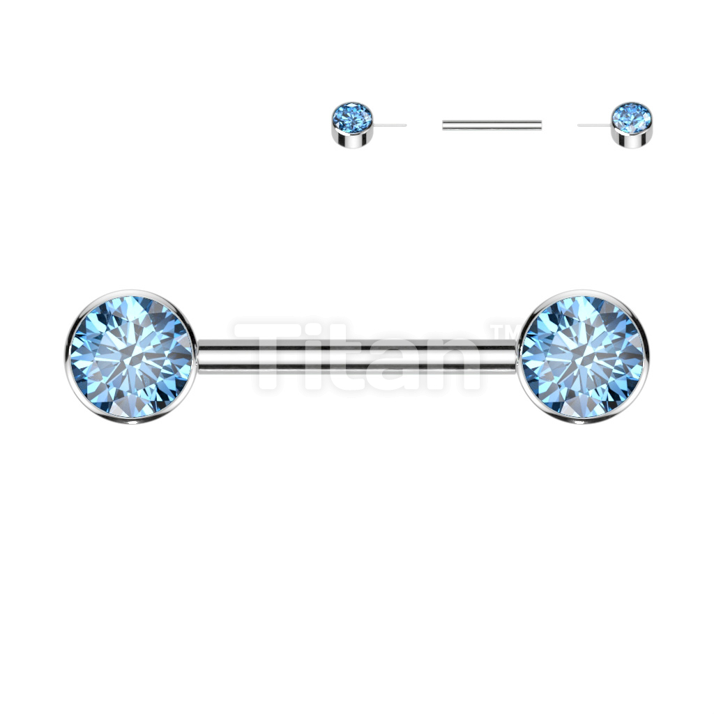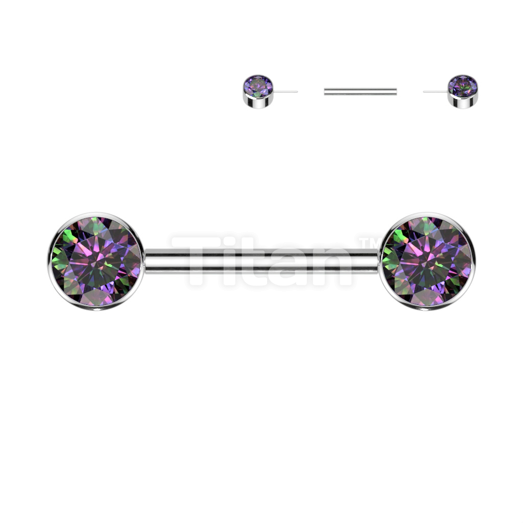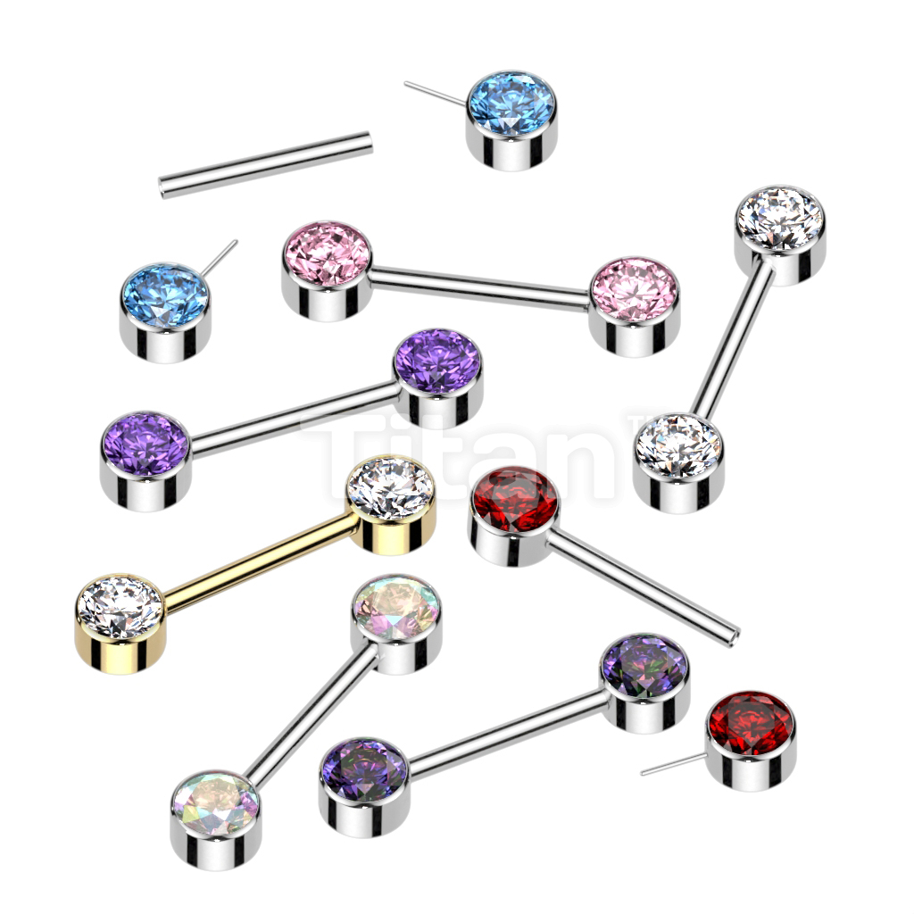 Implant Grade Titanium Threadless Push in Nipple Barbell With Forward Facing Bezel Set CZ Flat Ends