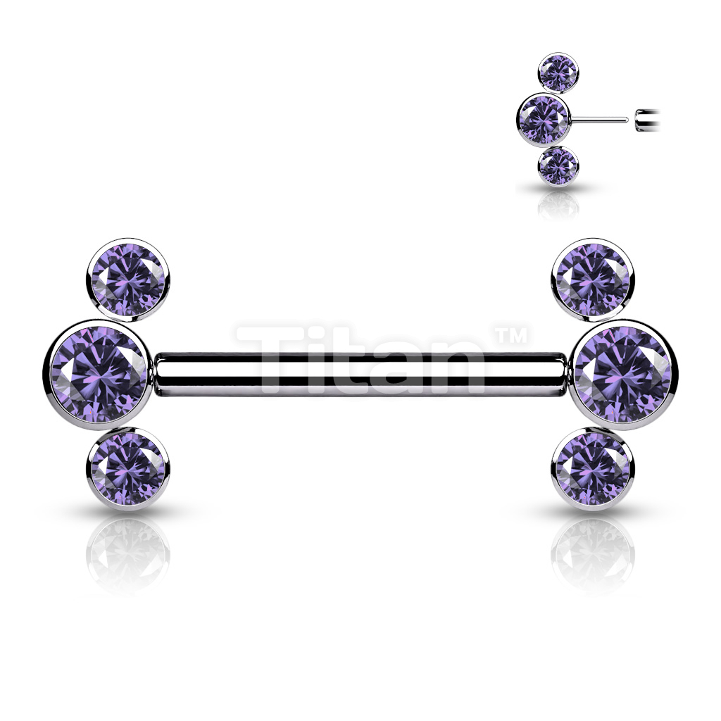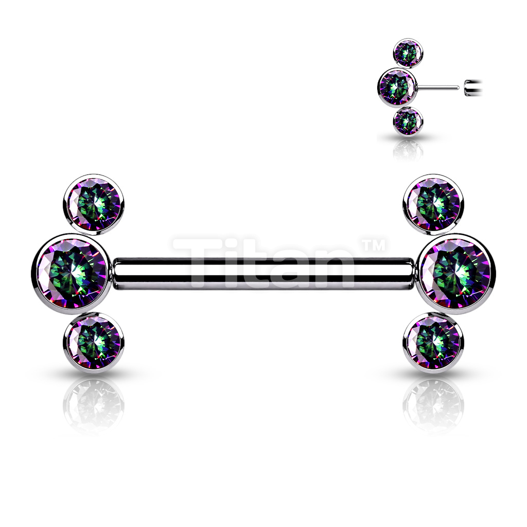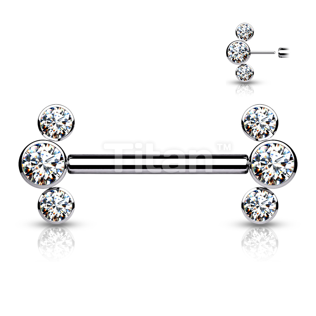 Implant Grade Titanium Threadless Push in Nipple Barbell With 3 Bezel Set CZ Ends