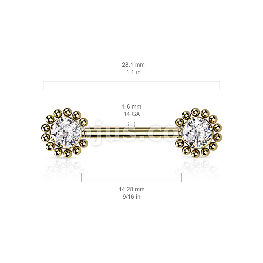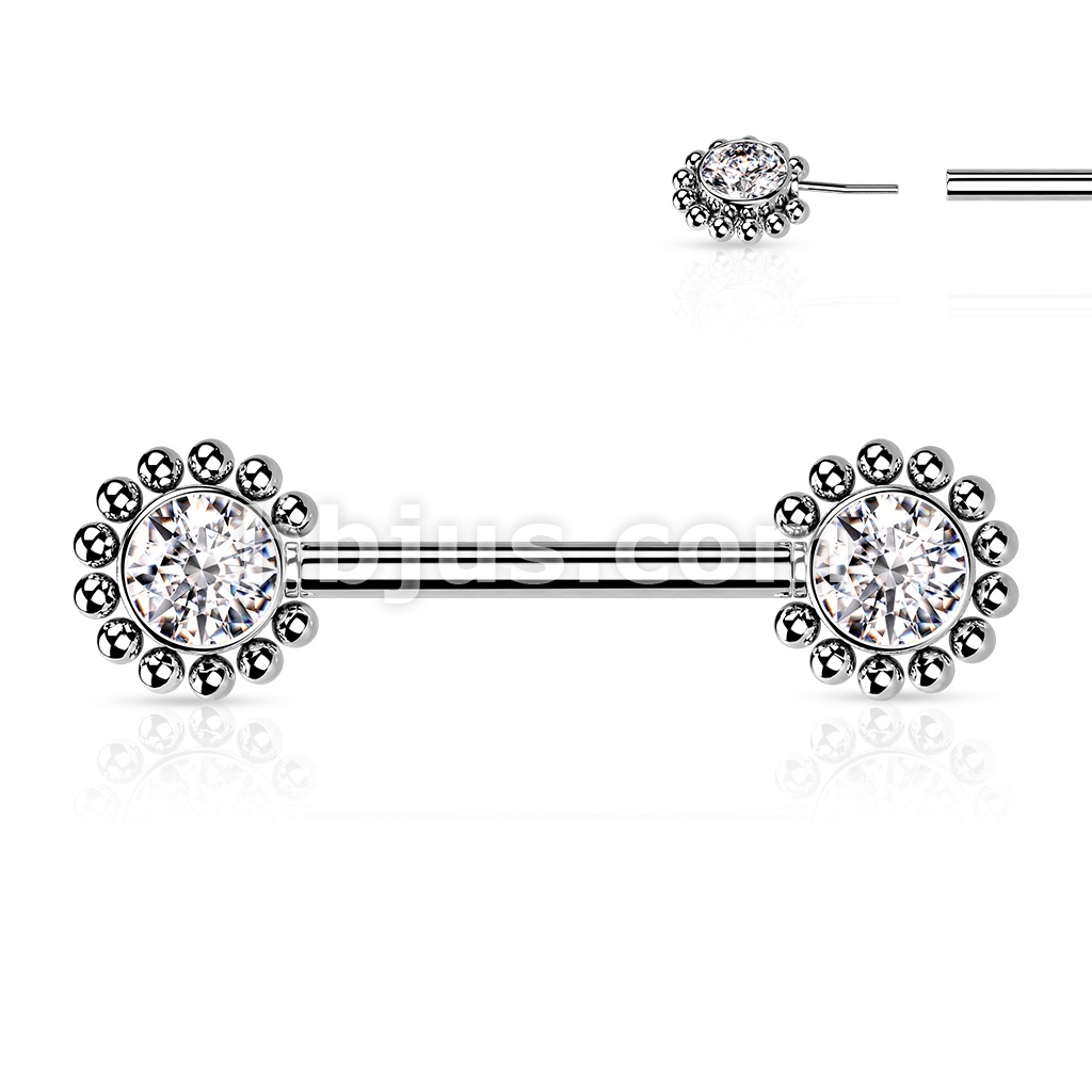 316L Surgical Steel Threadless Push In Nipple Barbell with Beaded Ball Edge and CZ Center On Each Side