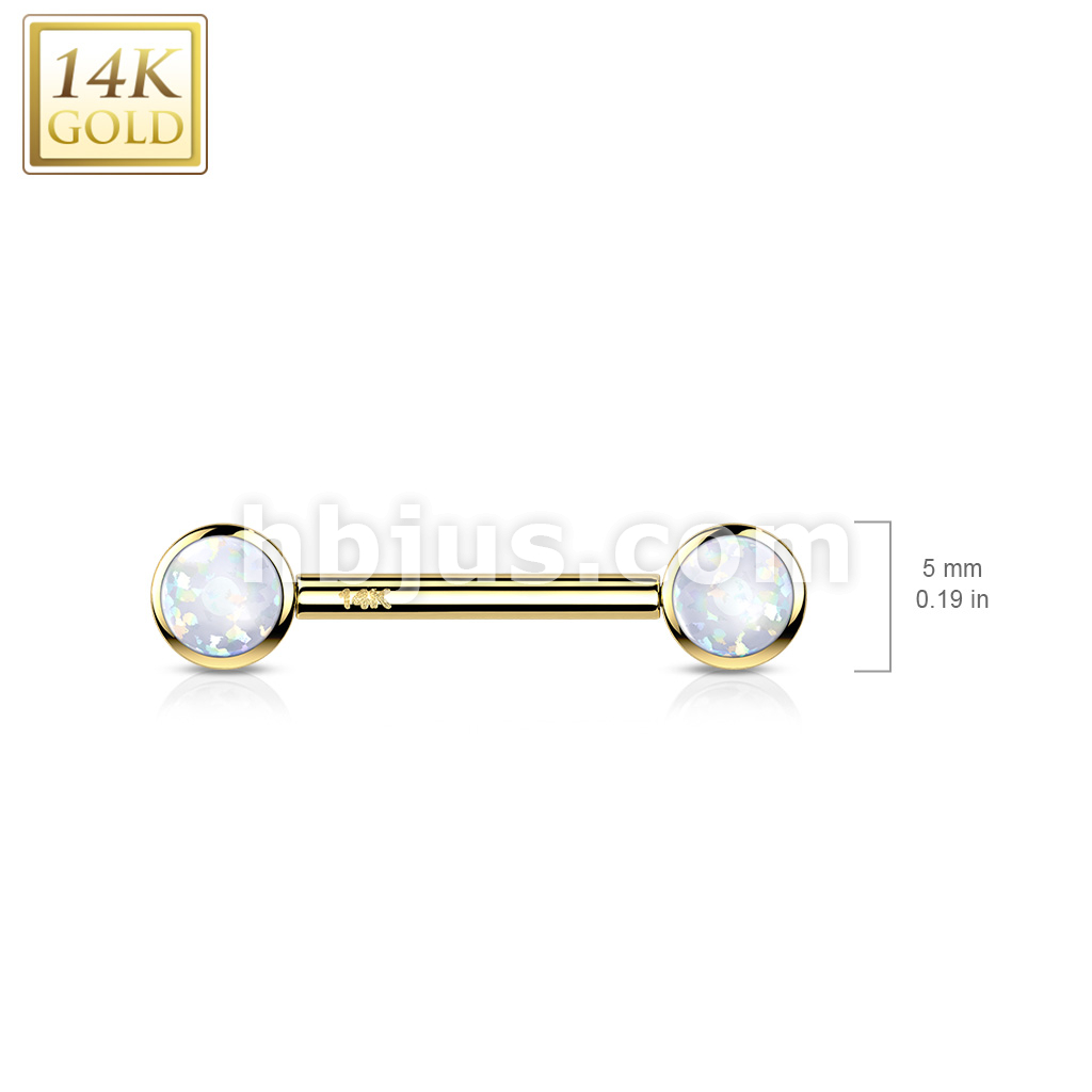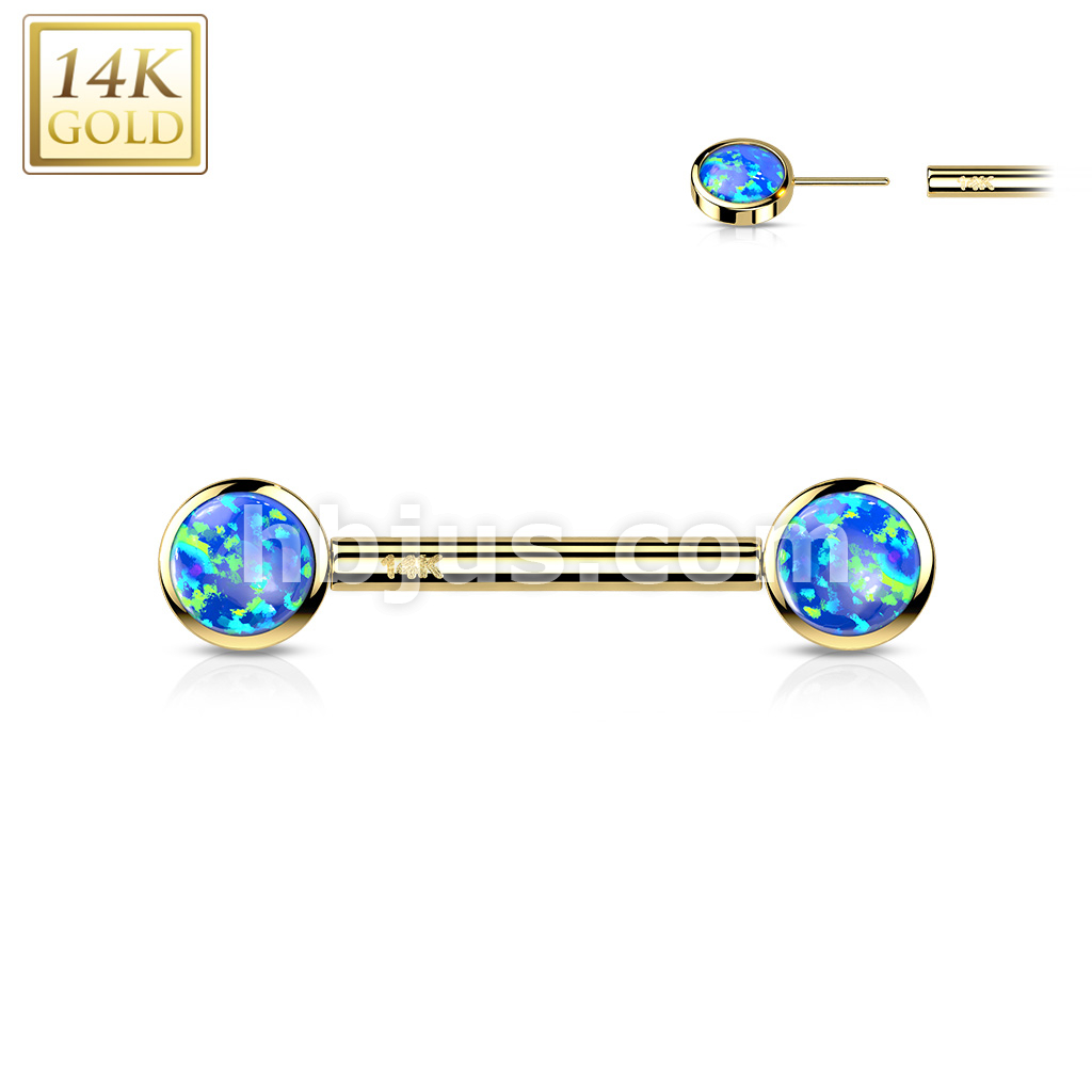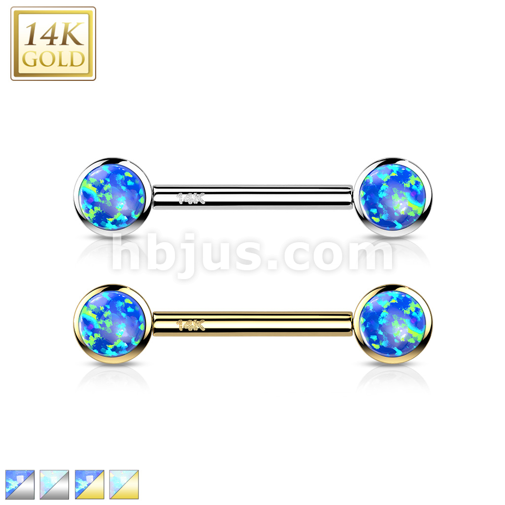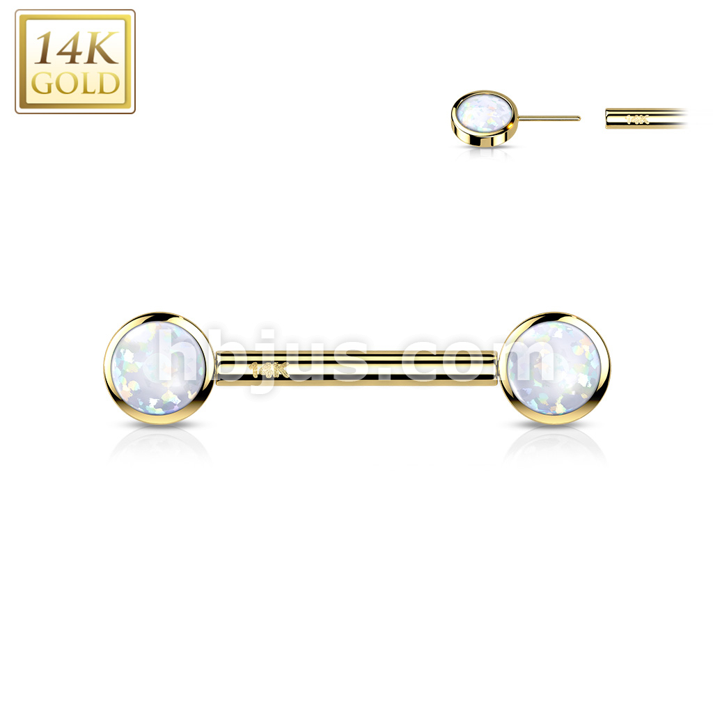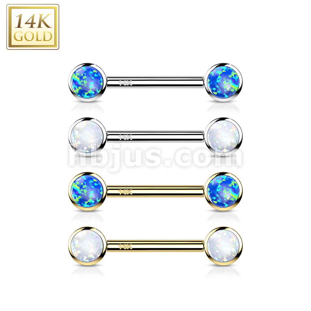 14K Gold Threadless Nipple Barbells with Round Bezel Set Opal Ends