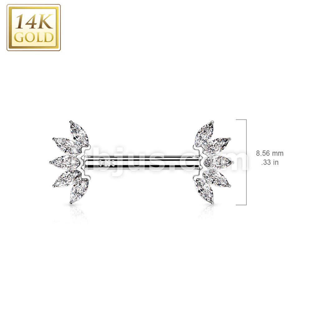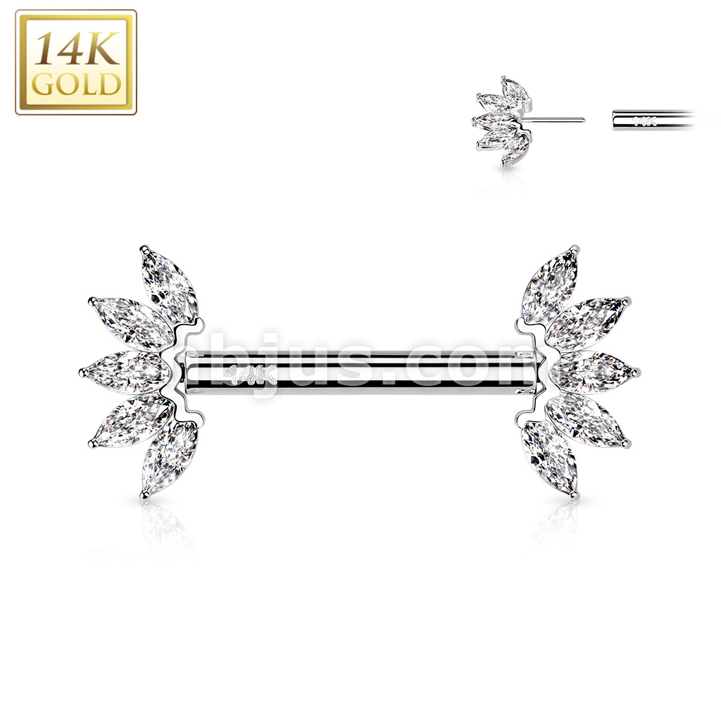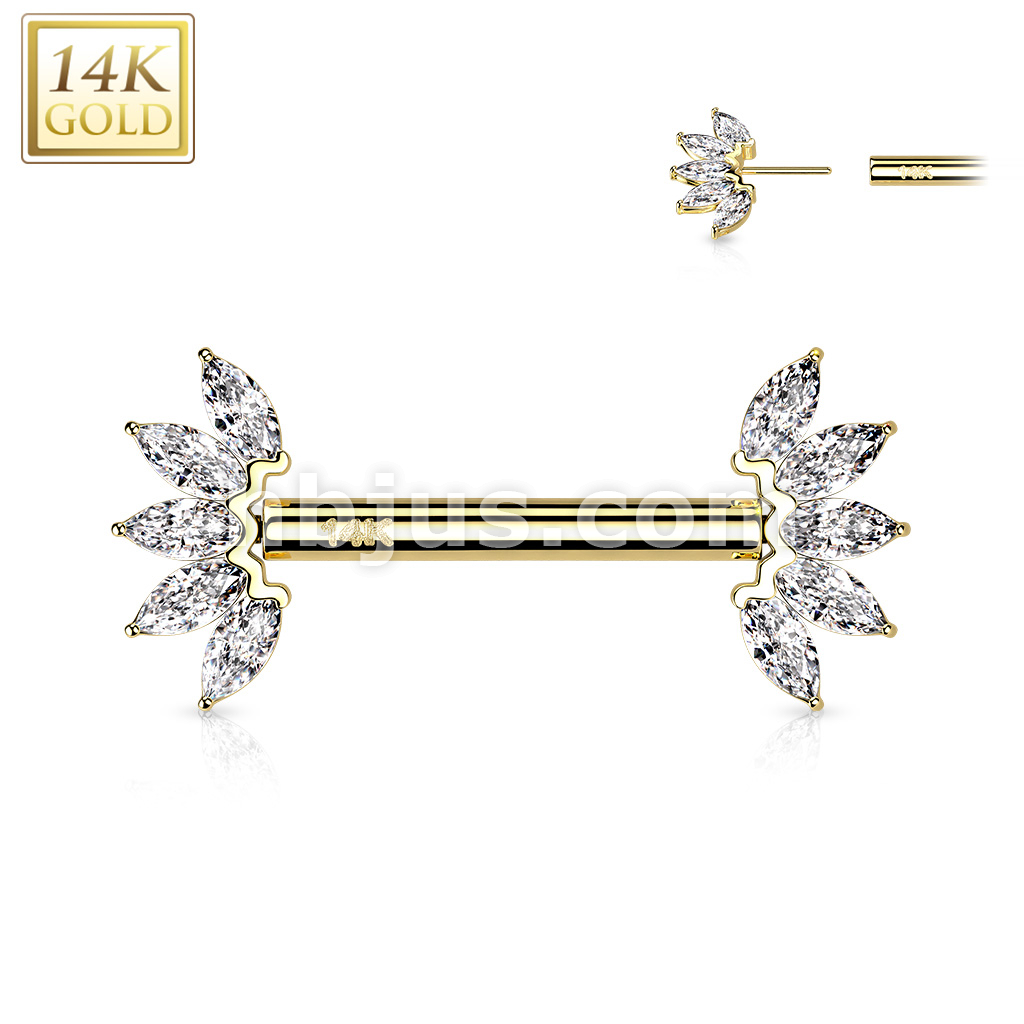 14K Gold Threadless Nipple Barbells with 5-Marquise CZ Set Fan Ends