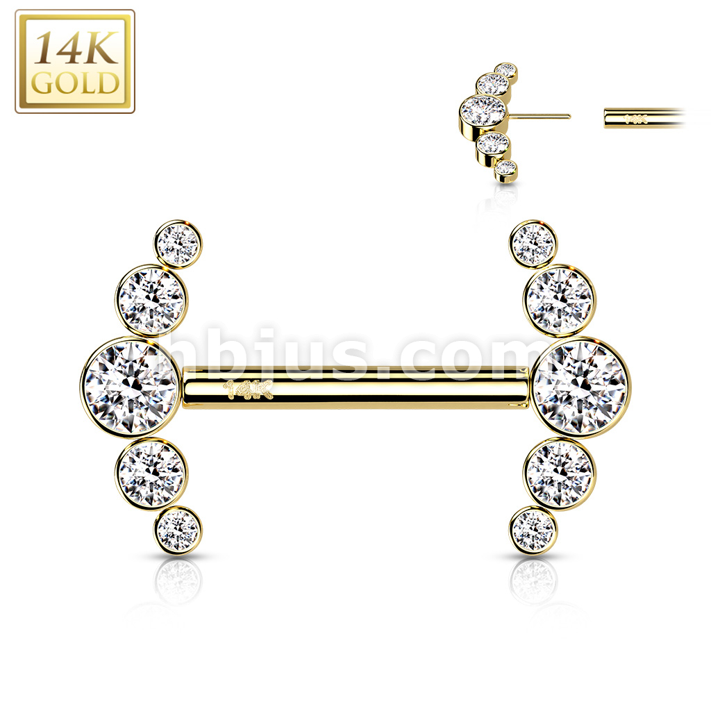 14K Gold Threadless Nipple Barbells with 5-Round CZ Bezel Set Curve Ends