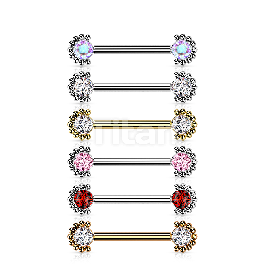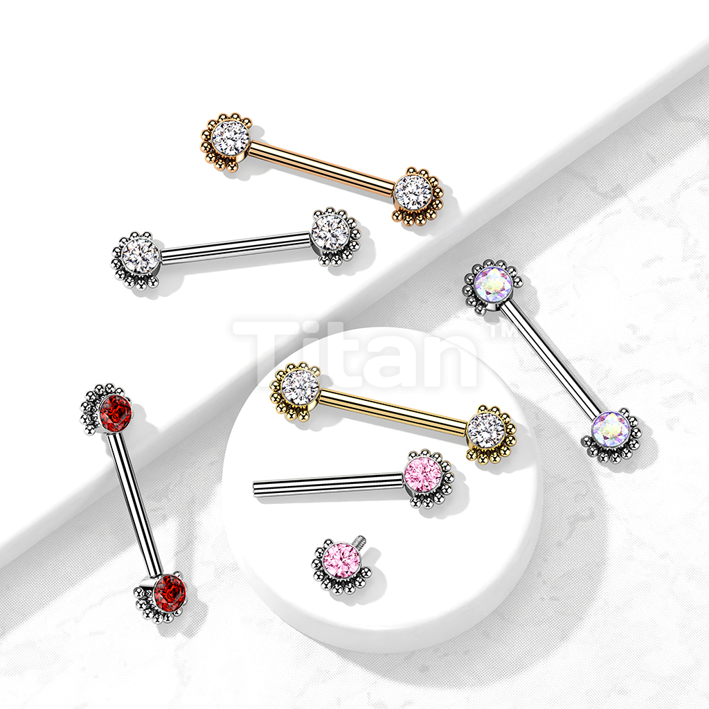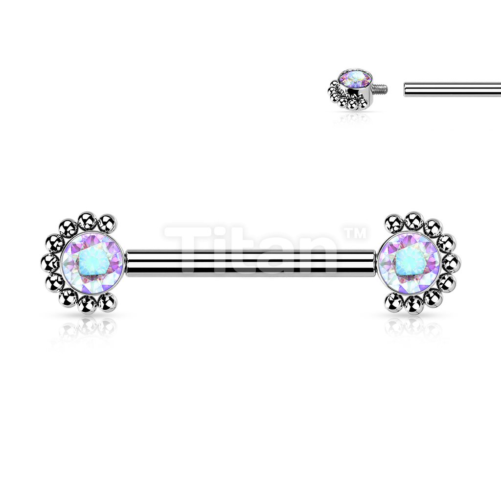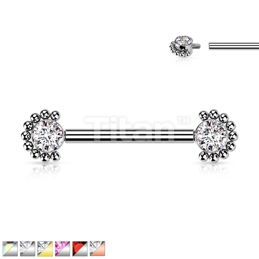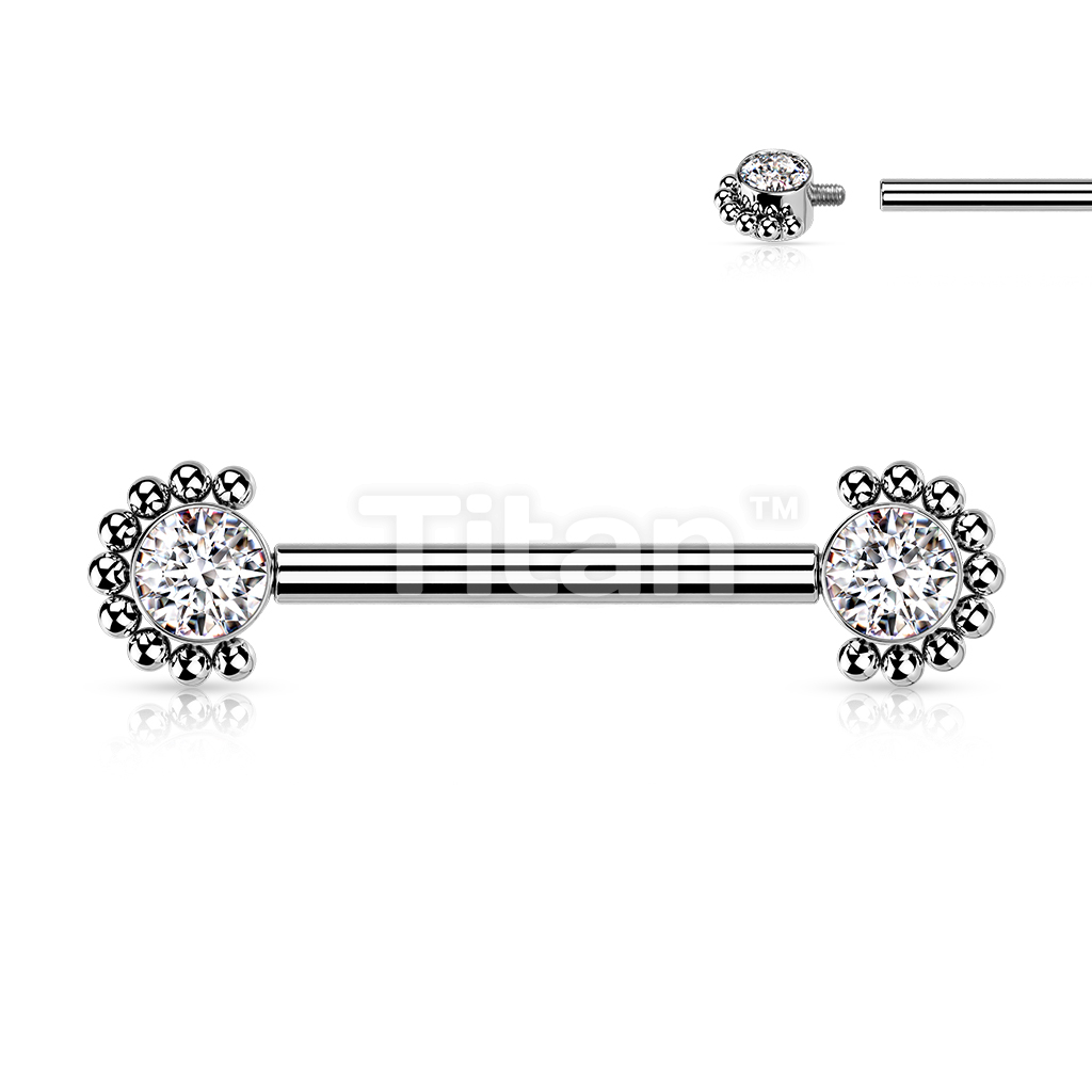 Implant Grade Titanium Internally Threaded Nipple Barbell With Bezel Set CZ Center and Beaded Edge Ends