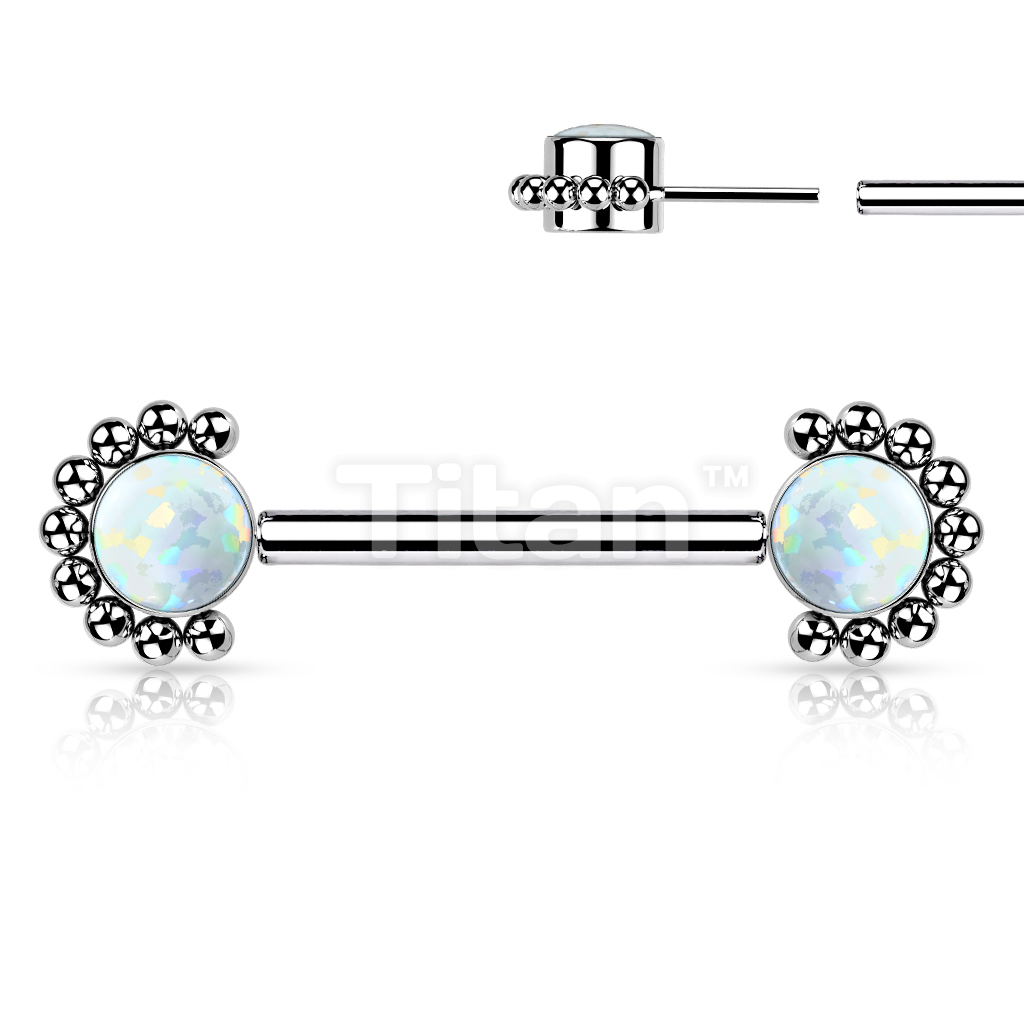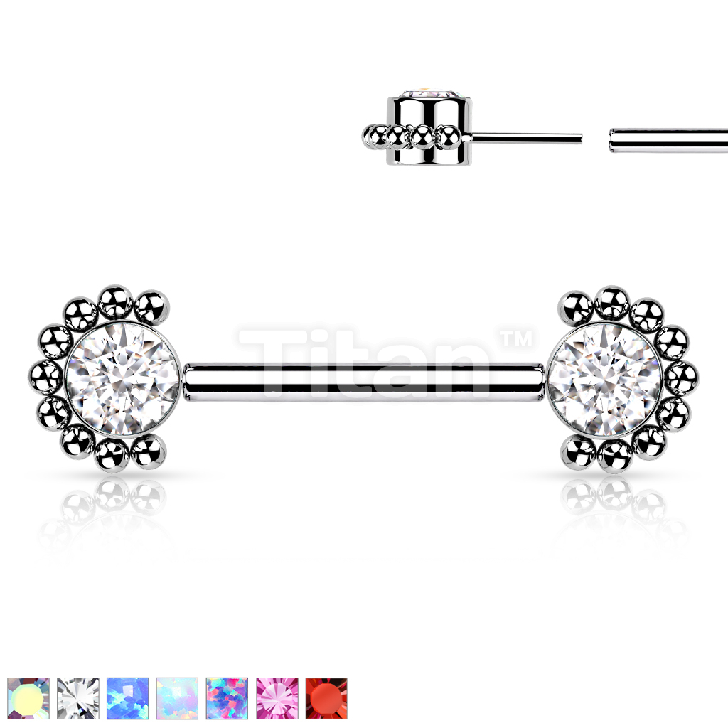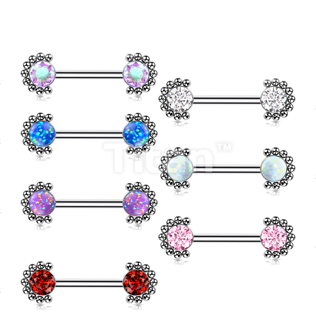 Implant Grade Titanium Threadless Push in Nipple Barbell With Forward Facing Bezel Set CZ or Opal and Beaded Ball Edge Ends