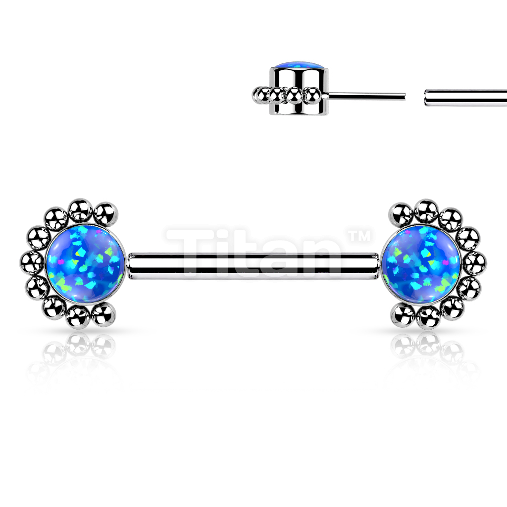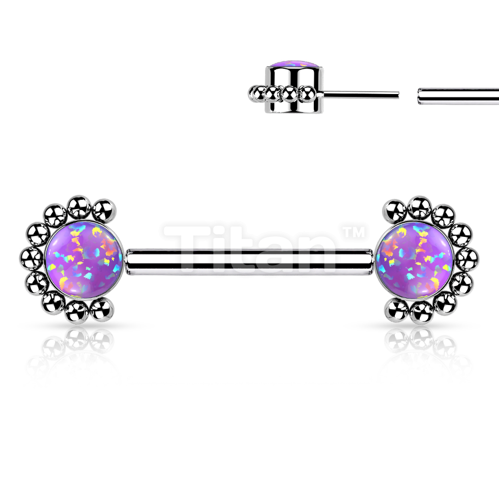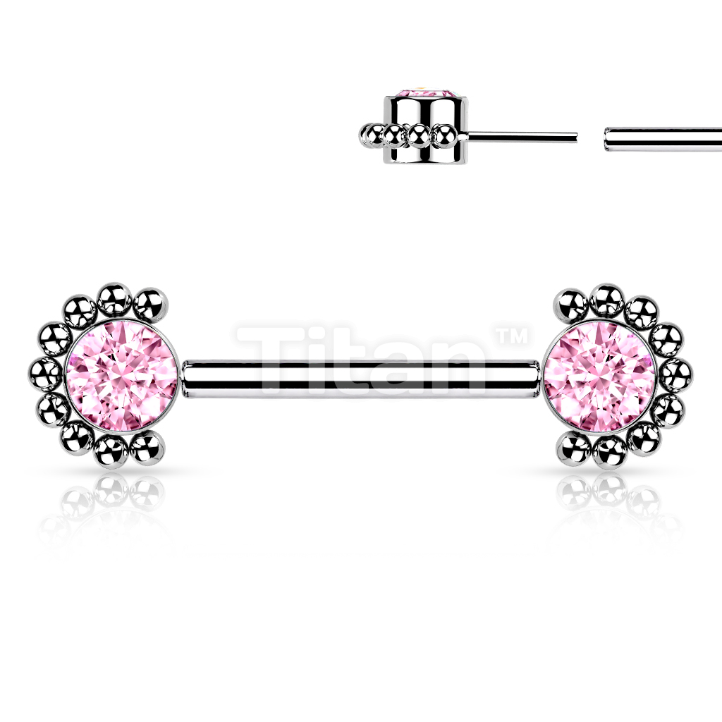 Implant Grade Titanium Threadless Push in Nipple Barbell With Forward Facing Bezel Set CZ or Opal and Beaded Ball Edge Ends