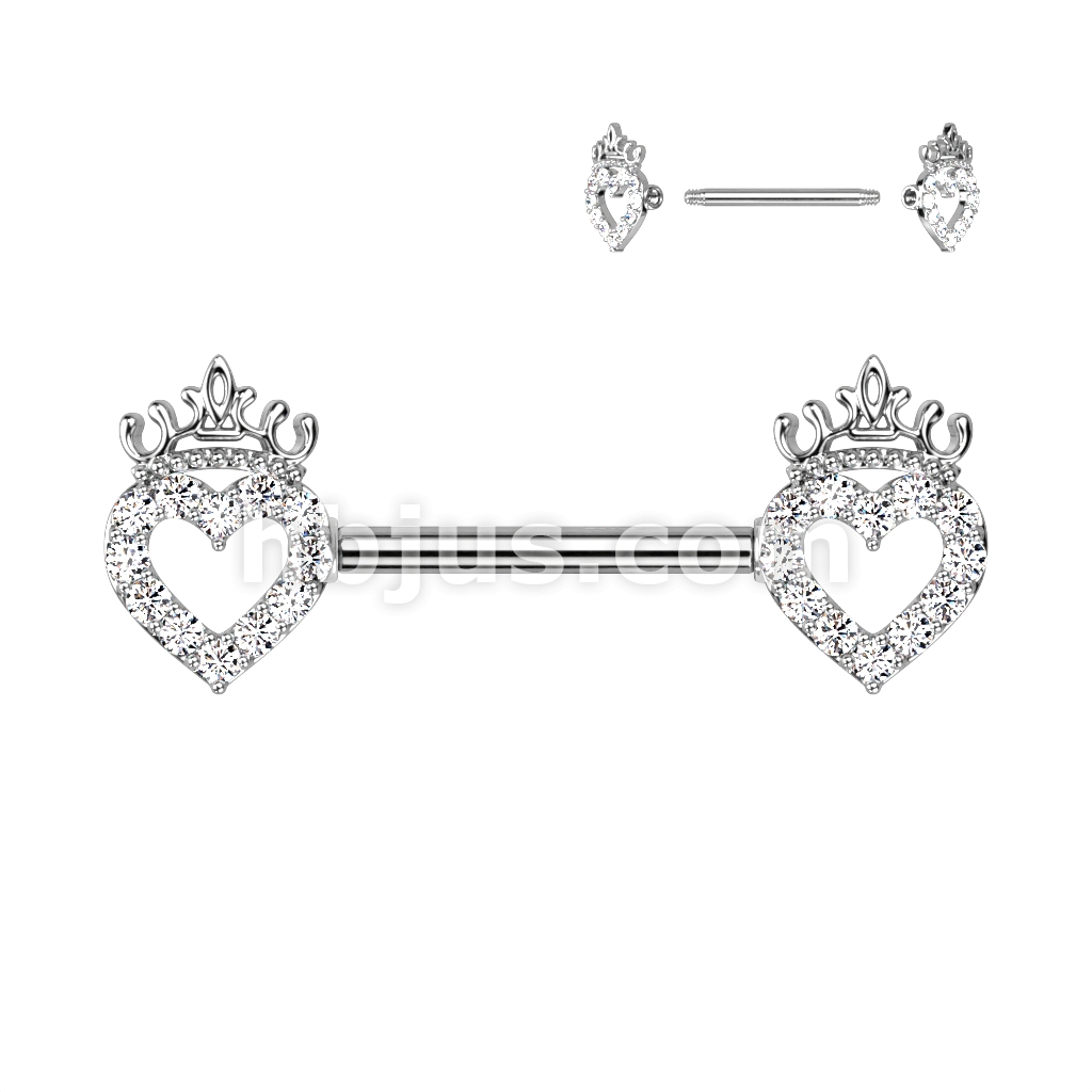 CZ Paved Hollow Heart and Crown 316L Surgical Steel Nipple Barbell Ring