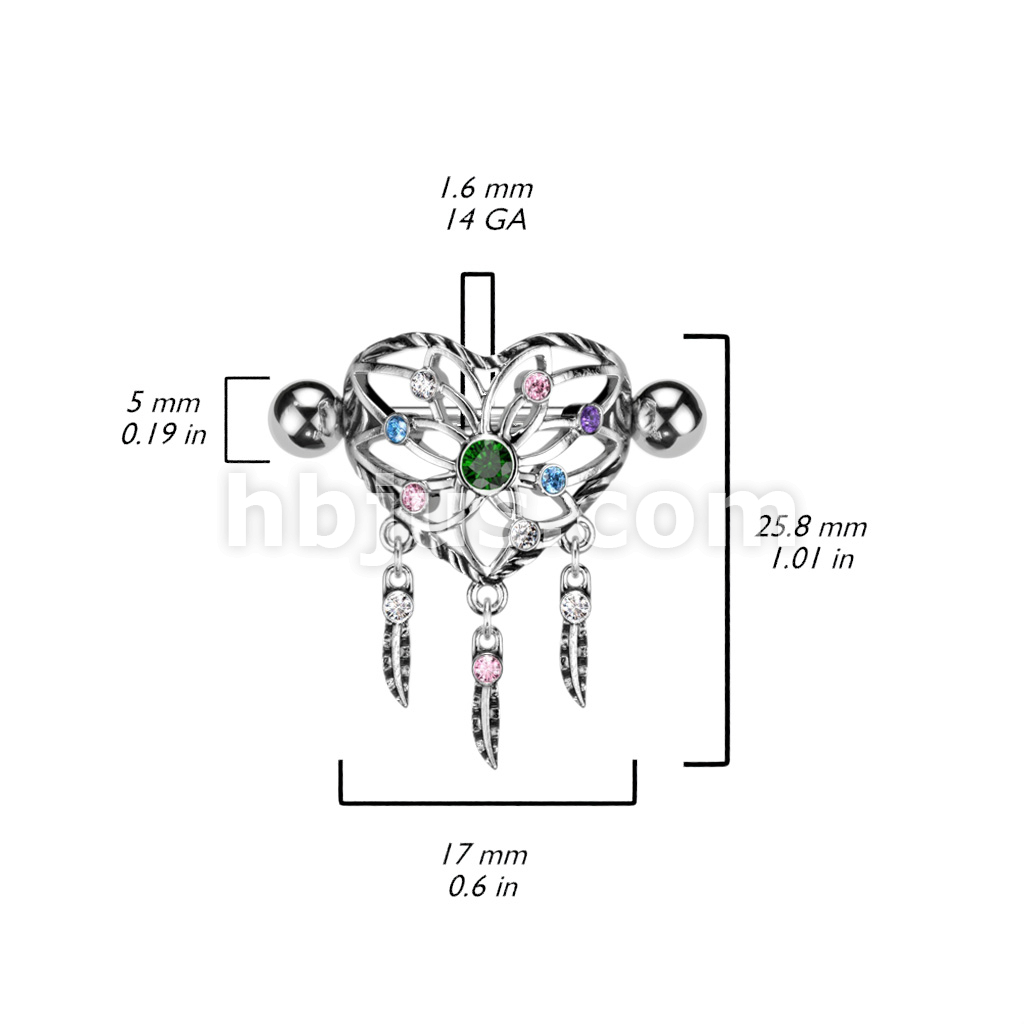 Heart Dream Catcher Shield Nipple Ring With Multi Color CZ and 316L Surgical Steel Barbell