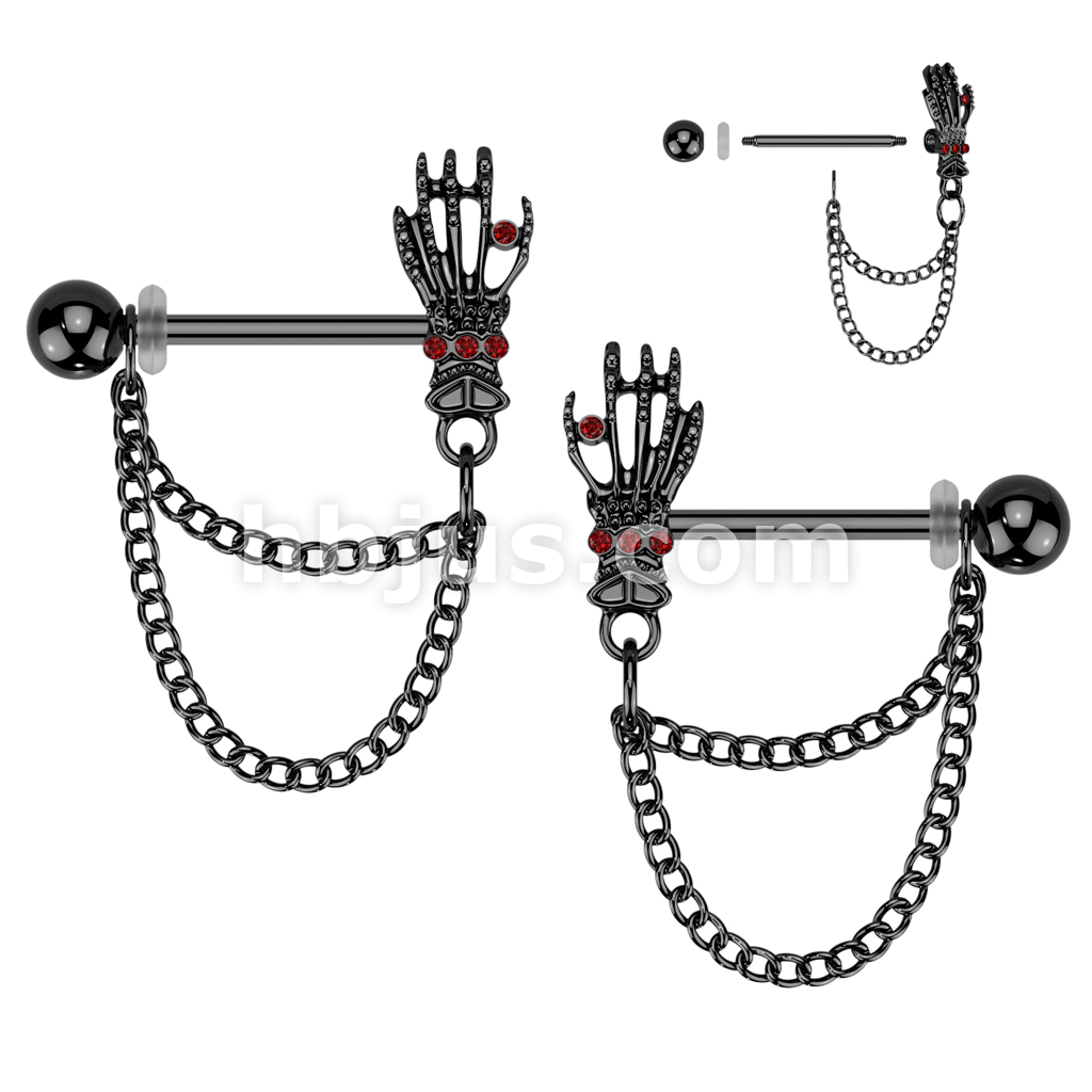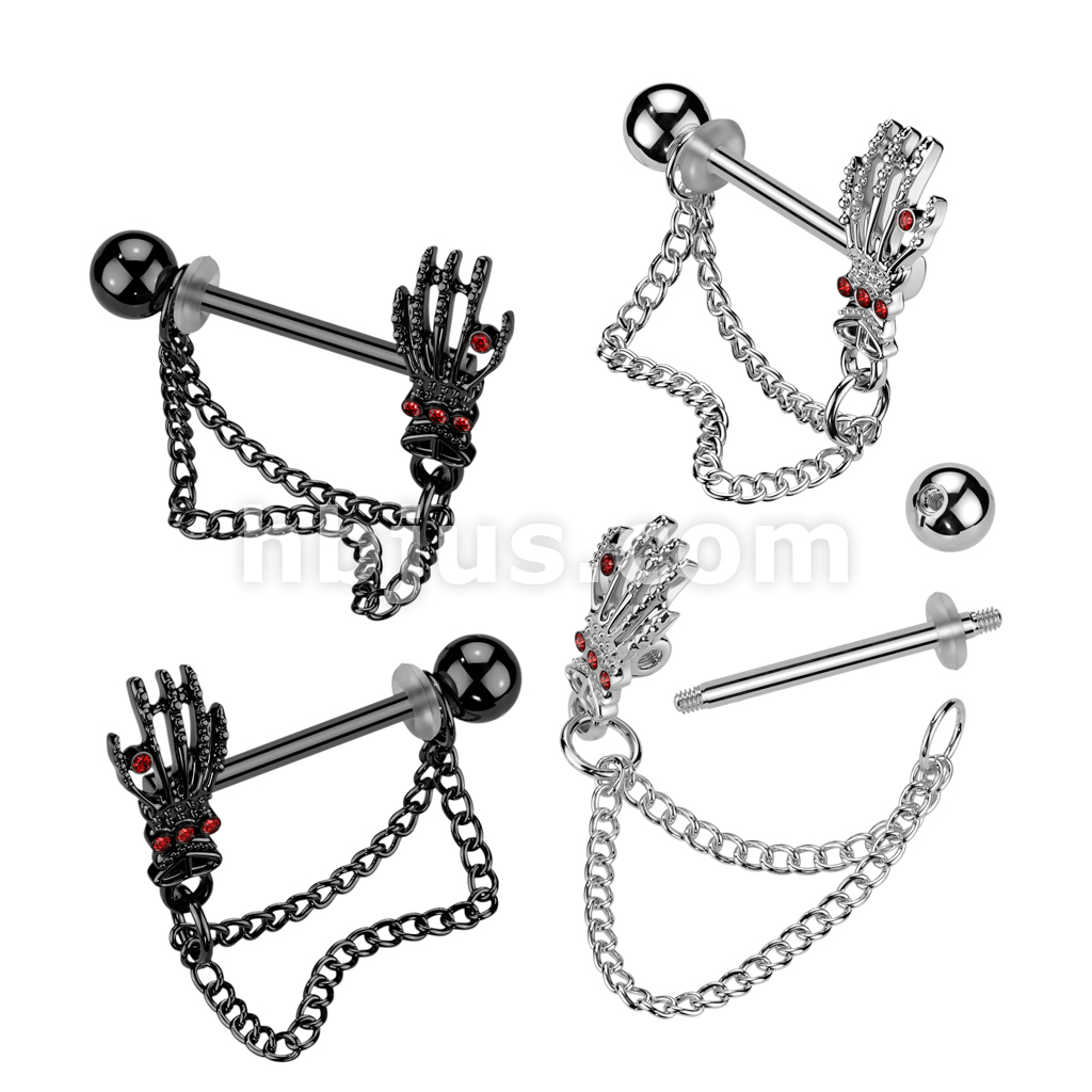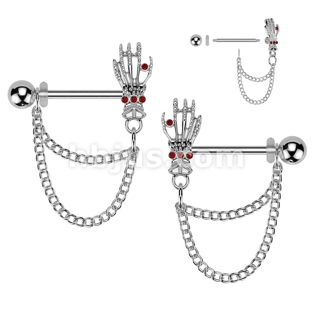 Pair of 316L Surgical Steel Nipple Barbell With Red CZ Skull Hands and Double Chain Dangle