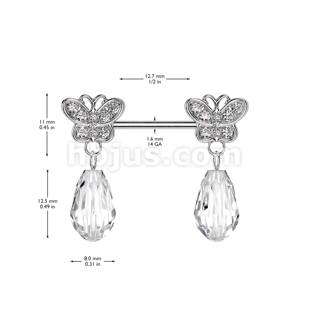 316L Surgical Steel Nipple Barbell With CZ Pave Butterfly and Acrylic Gem Dangle