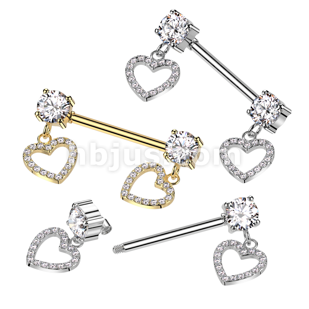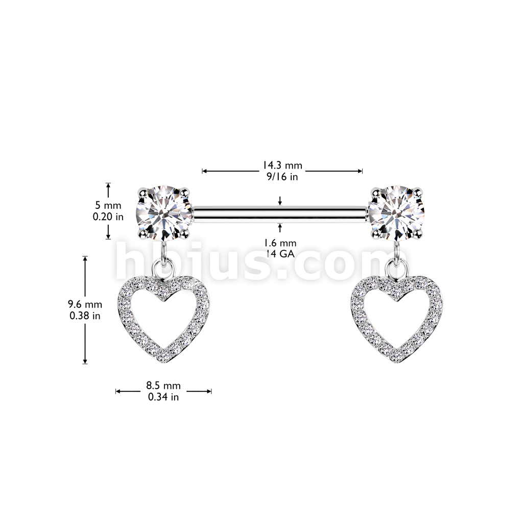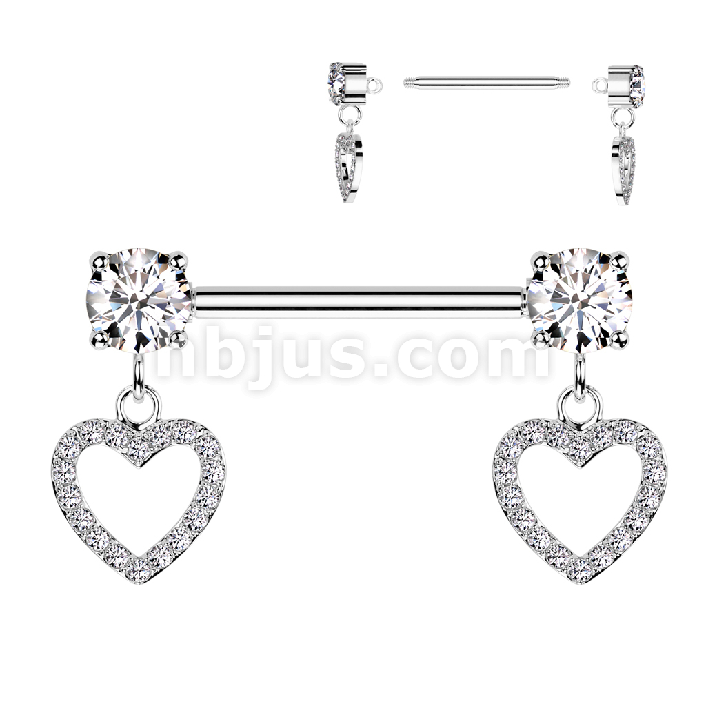 316L Surgical Steel Nipple Barbell With Round Prong Set CZ Ends and CZ Pave Hollow Heart Dangles