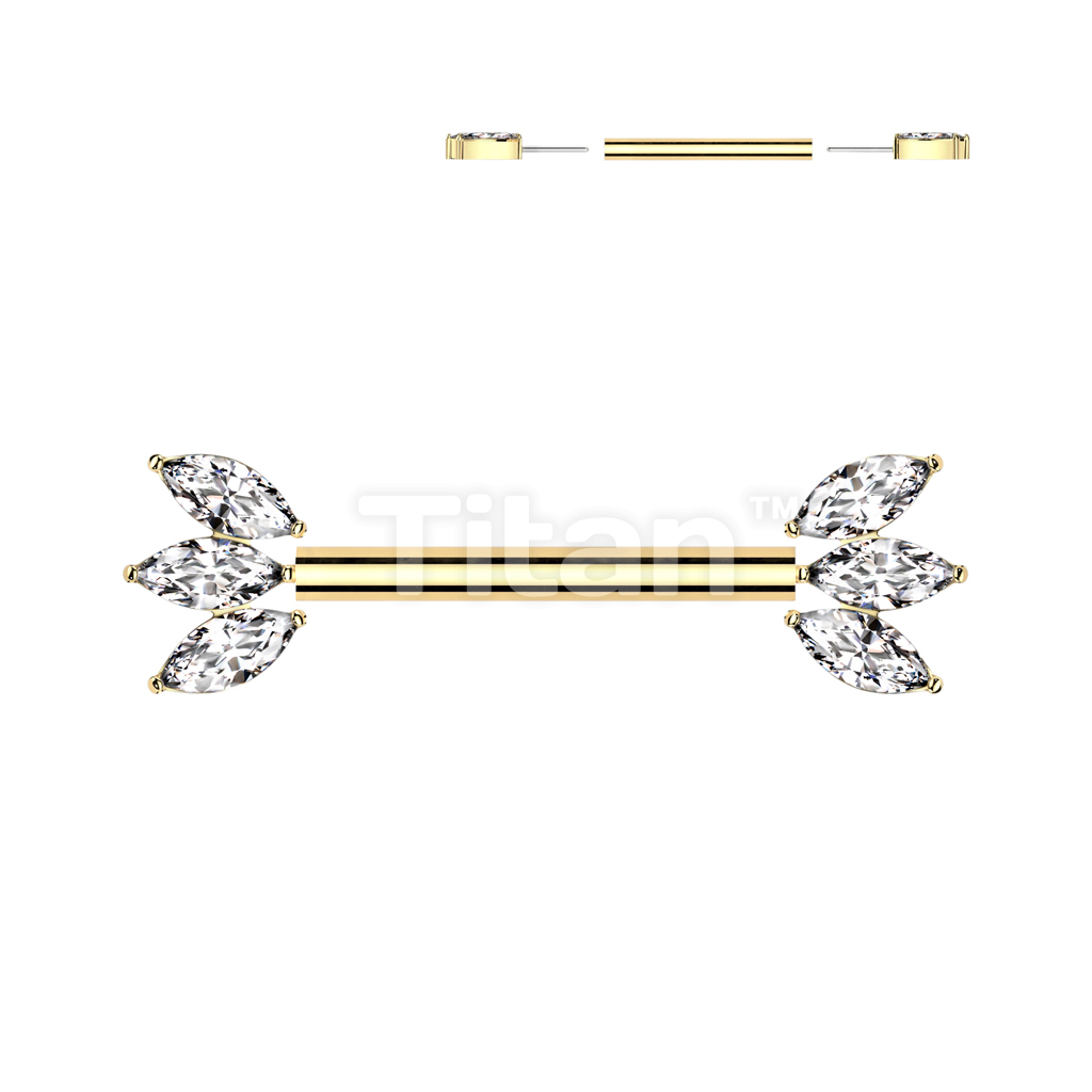 Implant Grade Titanium Threadless Push In Nipple Barbell With Forward Facing Triple Marquise CZ Ends