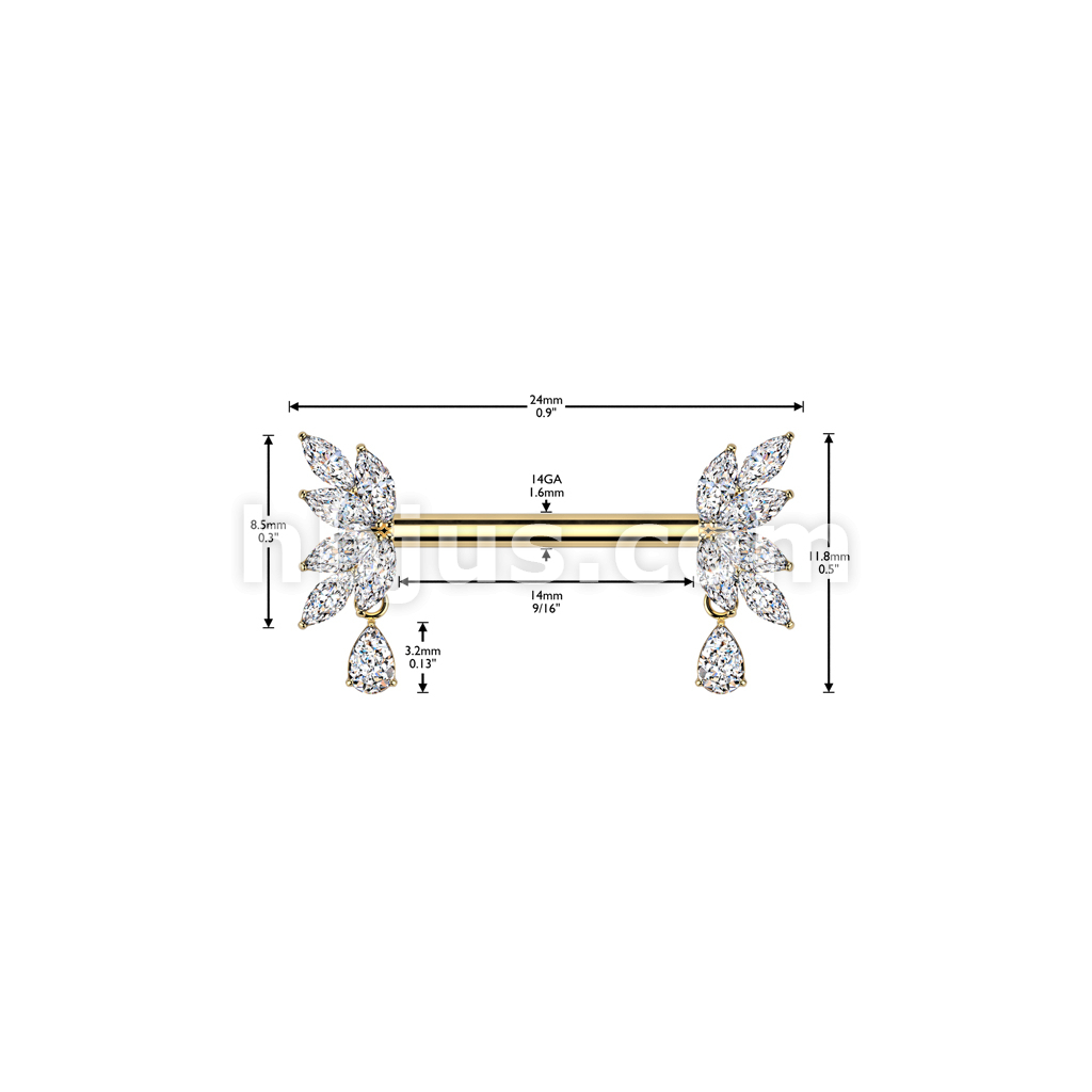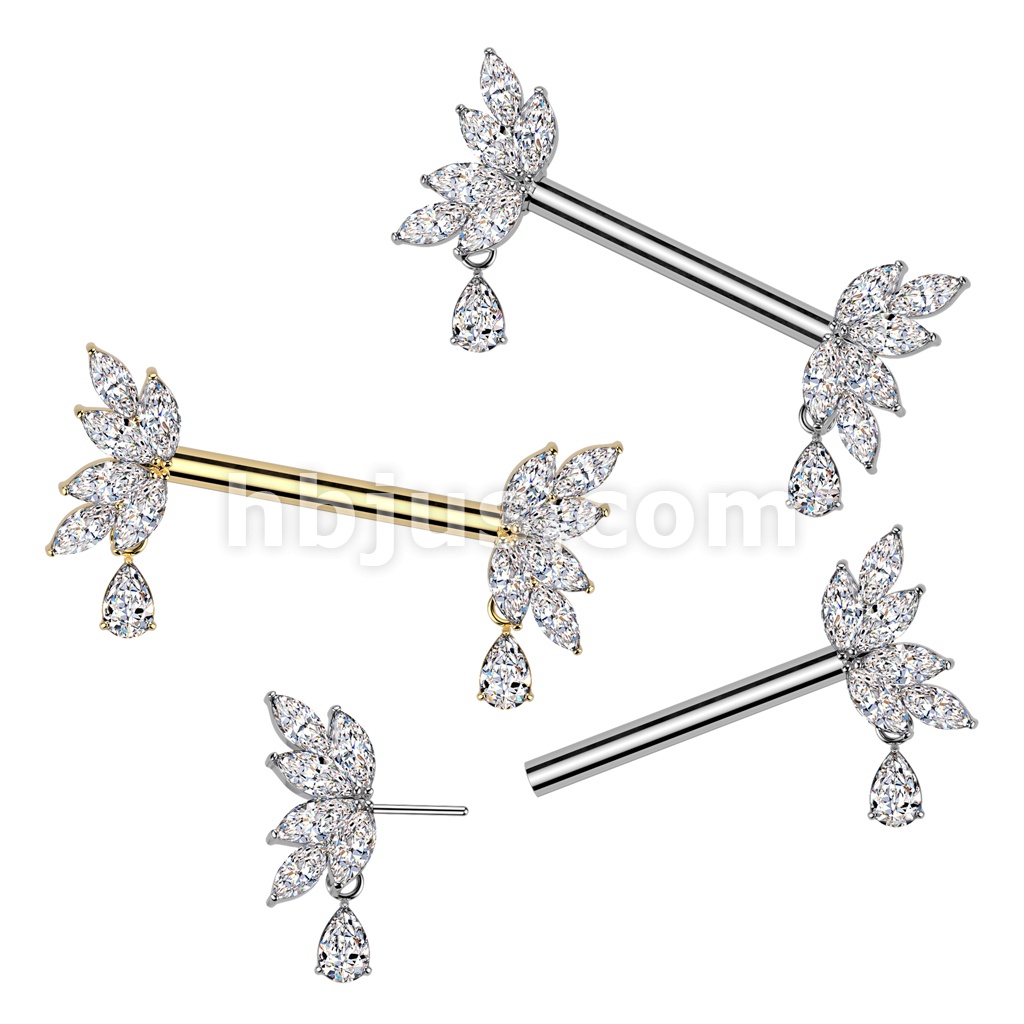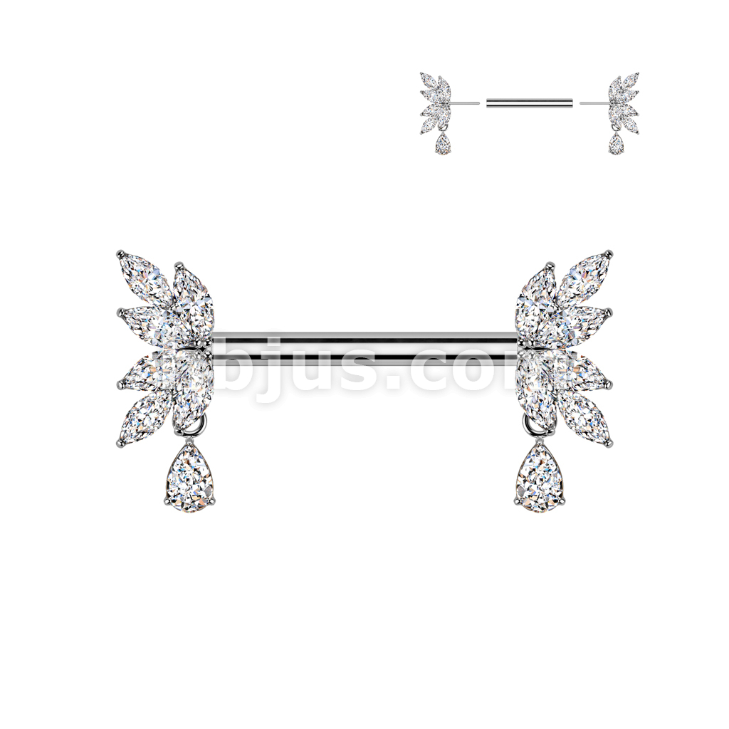 316L Surgical Steel Threadless Push In Marquise CZ Fan Nipple Barbell With Teardrop CZ Dangle