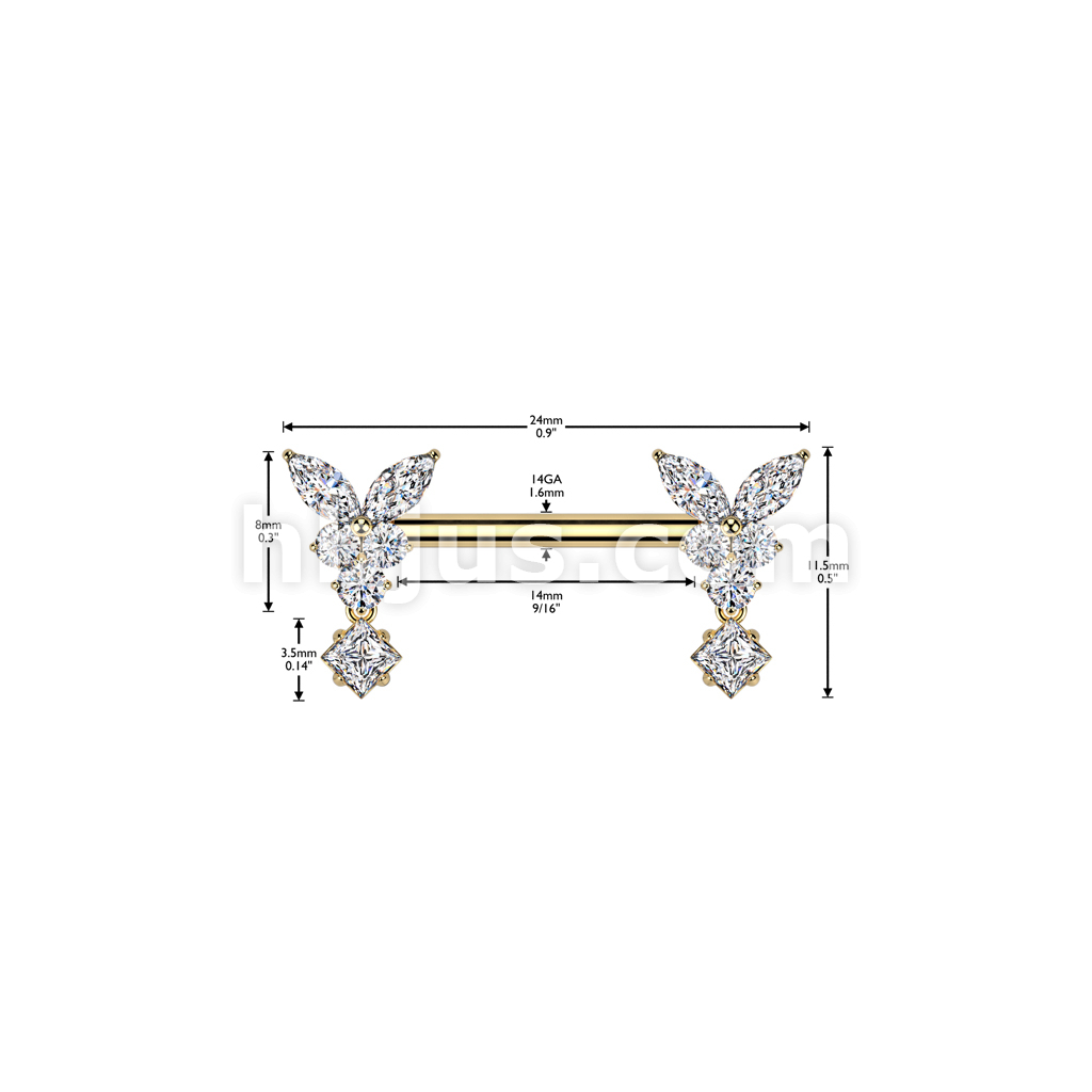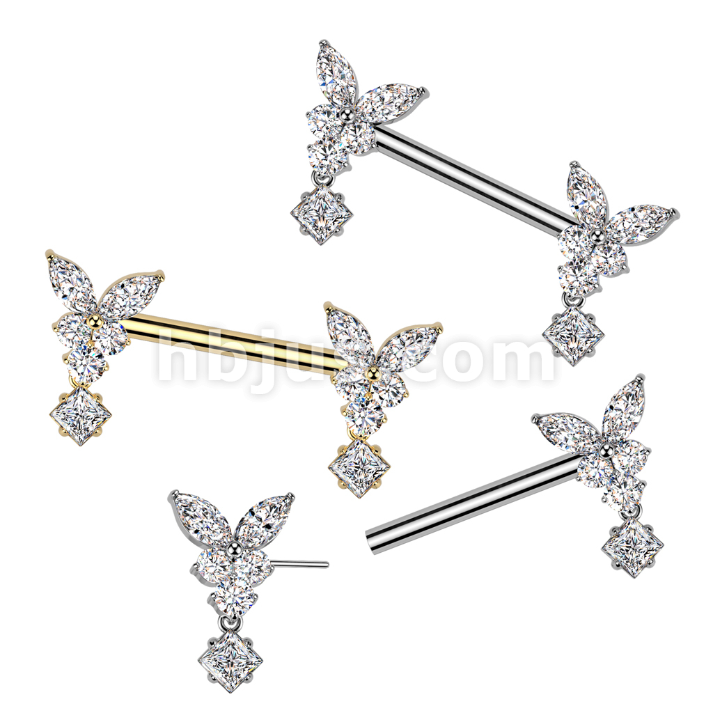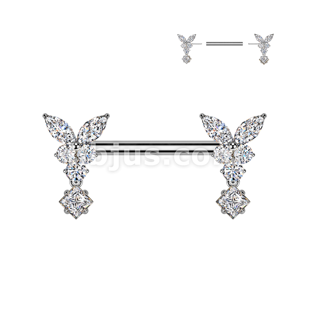 316L Surgical Steel Threadless Push In Butterfly CZ Nipple Barbell With Diamond CZ Dangle
