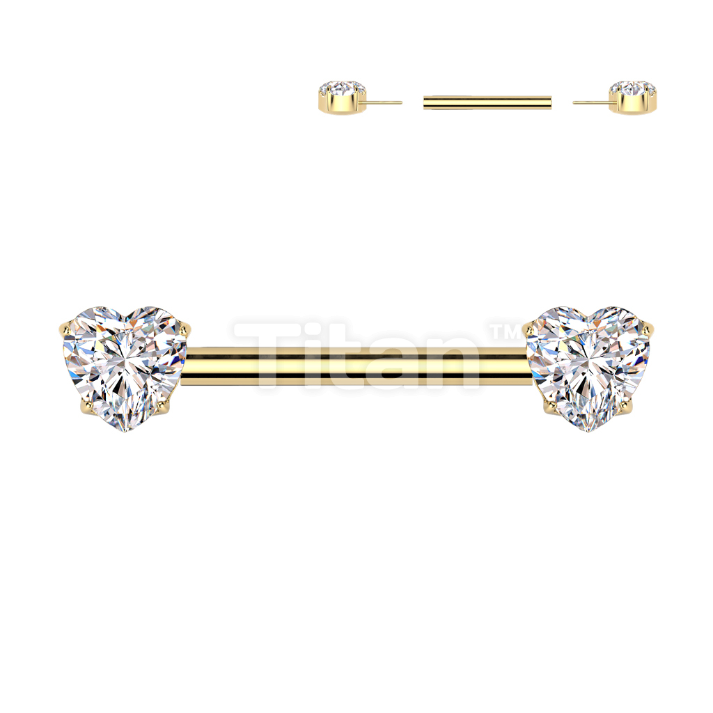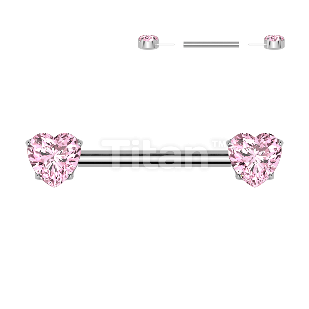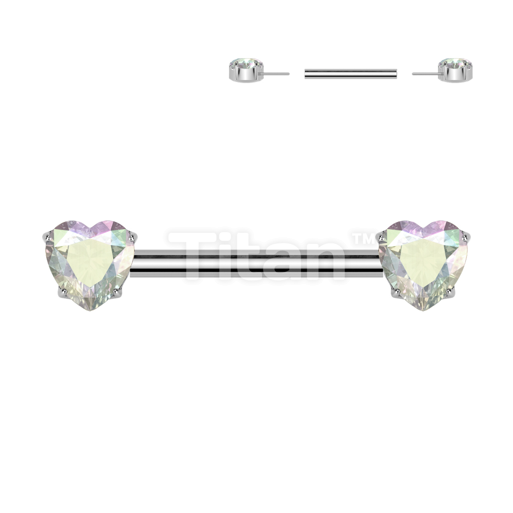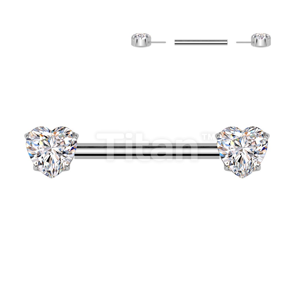 Implant Grade Titanium Threadless Push In Nipple Barbell With 4 Prong Set Heart CZ Rounded Back Ends