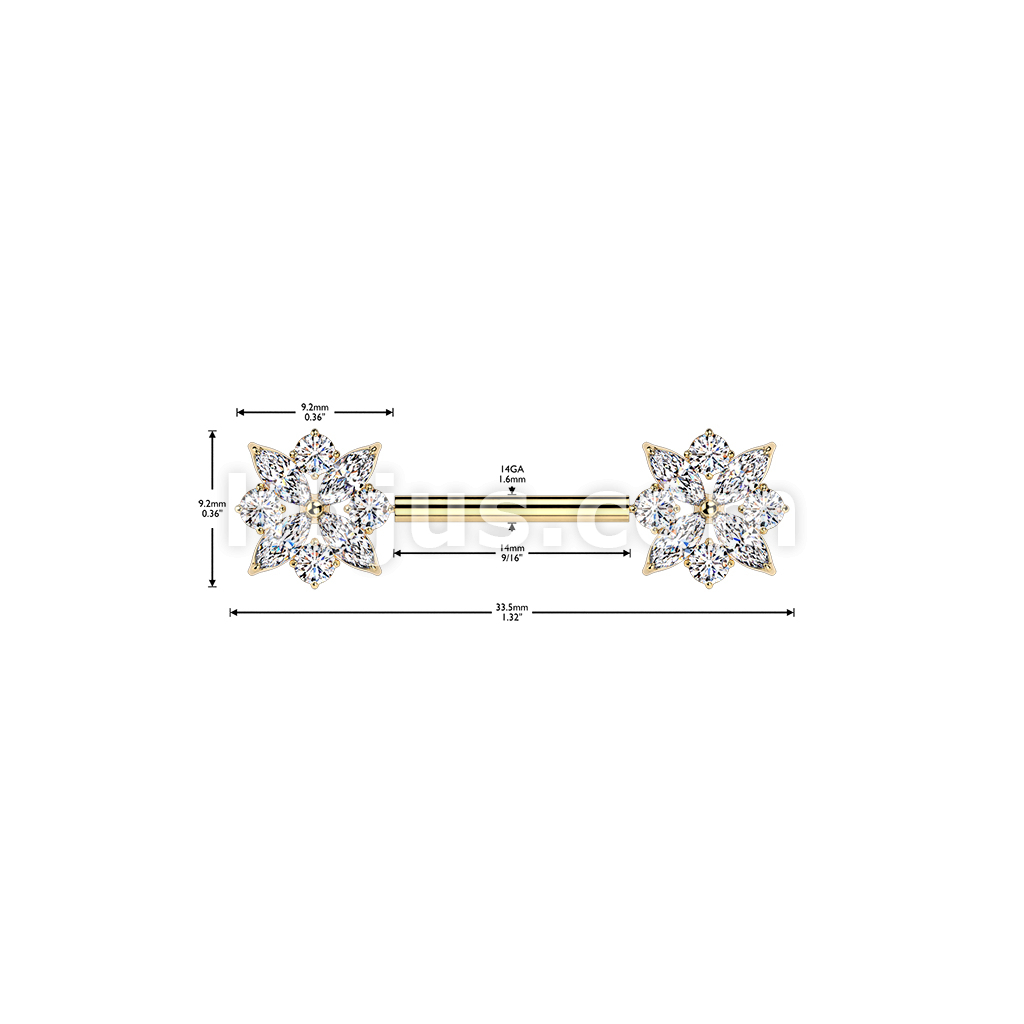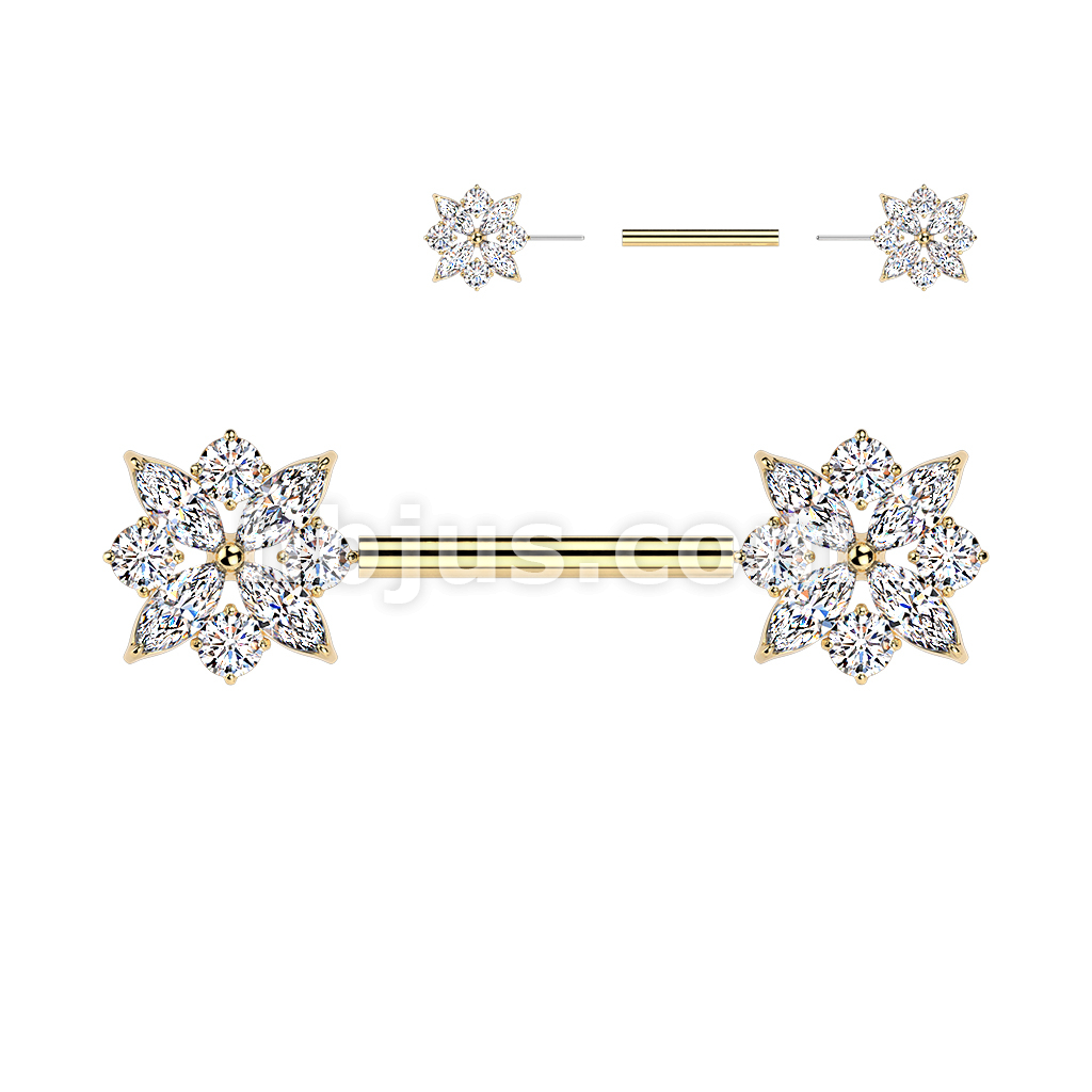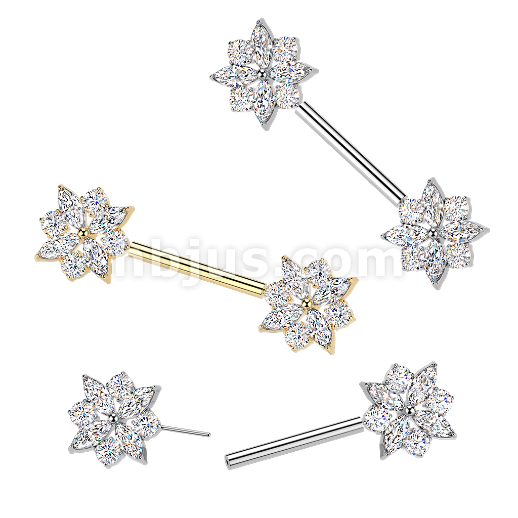 316L Threadless Push In CZ Cluster With CZ Flower Center Nipple Barbell