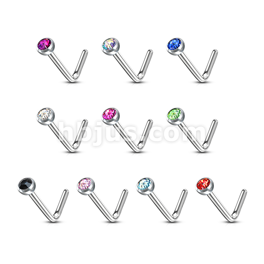 Press Fit Gem 316L Surgical Steel L Bend Nose Ring Assorted Colors 200pc Pack (2 size options, 20pcs x 10 colors)