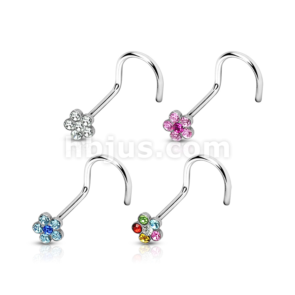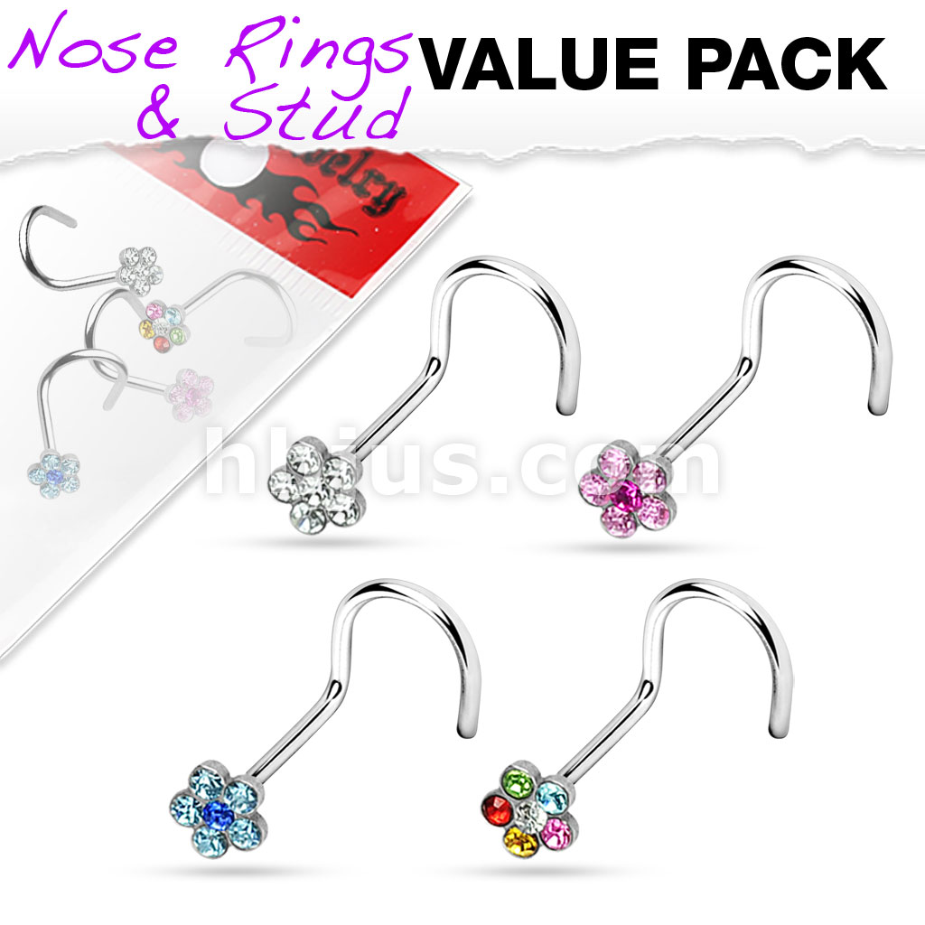 4 Pcs Value Pack of Assorted 316L Surgical Steel  6-Gem Flower Nose Screw