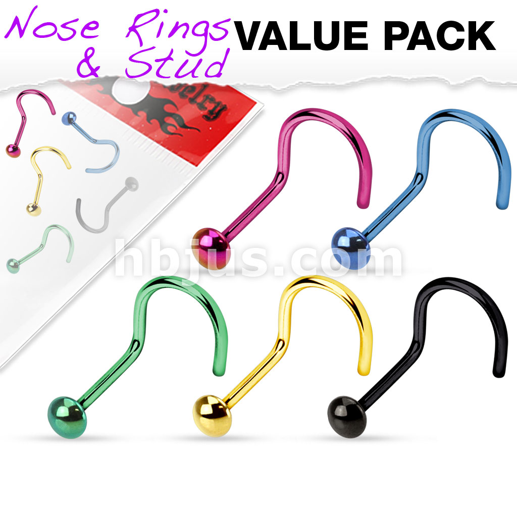 5 Pcs Value Pack of Assorted Dome Top Titanium IP Over 316L Surgical Steel Nose Screw