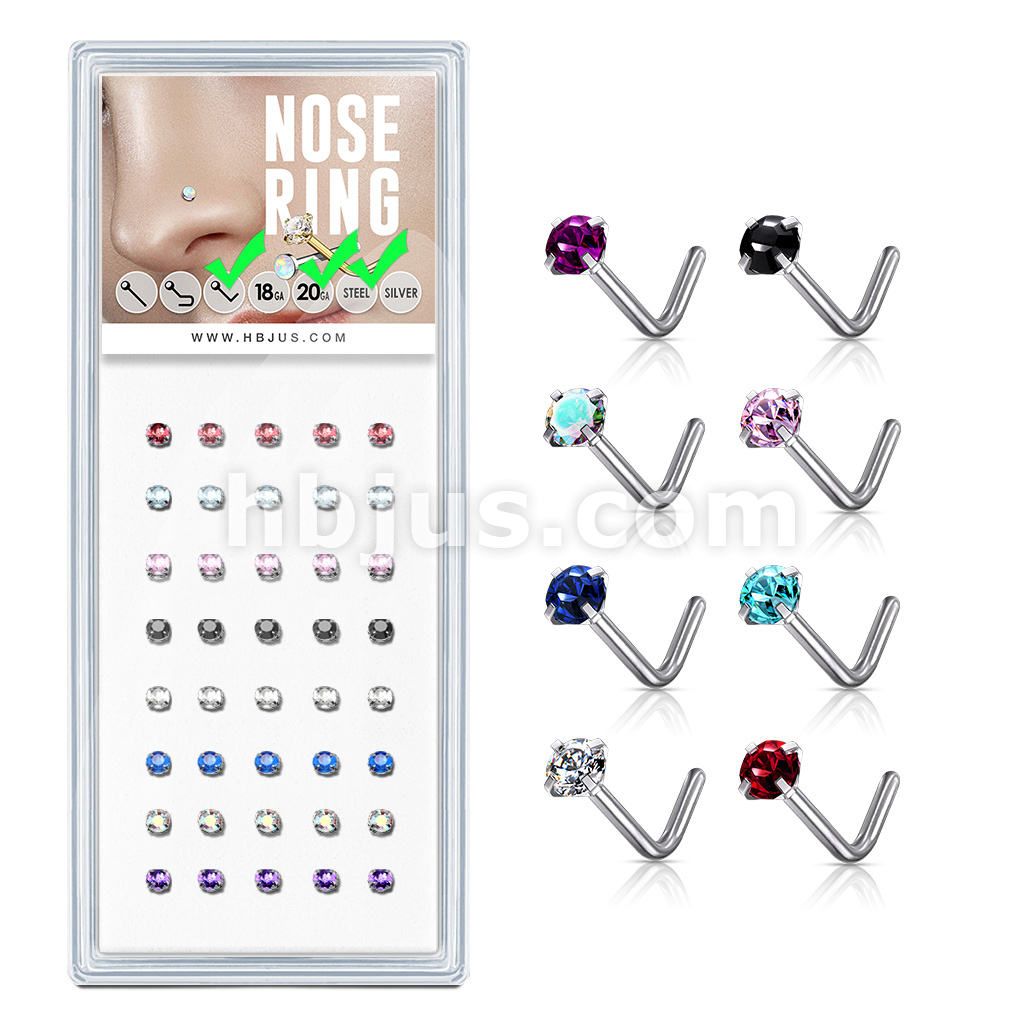 40 Pcs of 20 Gauge L Bend Prong Set Mixed Color CZ 316L Surgical Steel Nose Bone Package