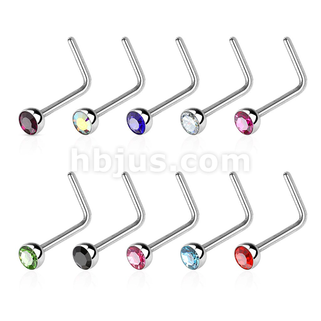 200 Pcs 316L Surgical Steel "L" Bend Nose Stud Ring with Mixed Color Jewel set Half ball end Bulk Pack (20 pcs x 10 Colors)