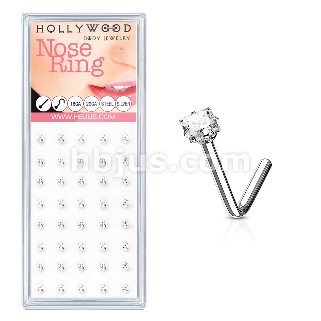 40 Pcs Pre Loaded 3mm Clear Square CZ Prong Set 316L Surgical Steel "L" Bend Nose Stud Ring Package