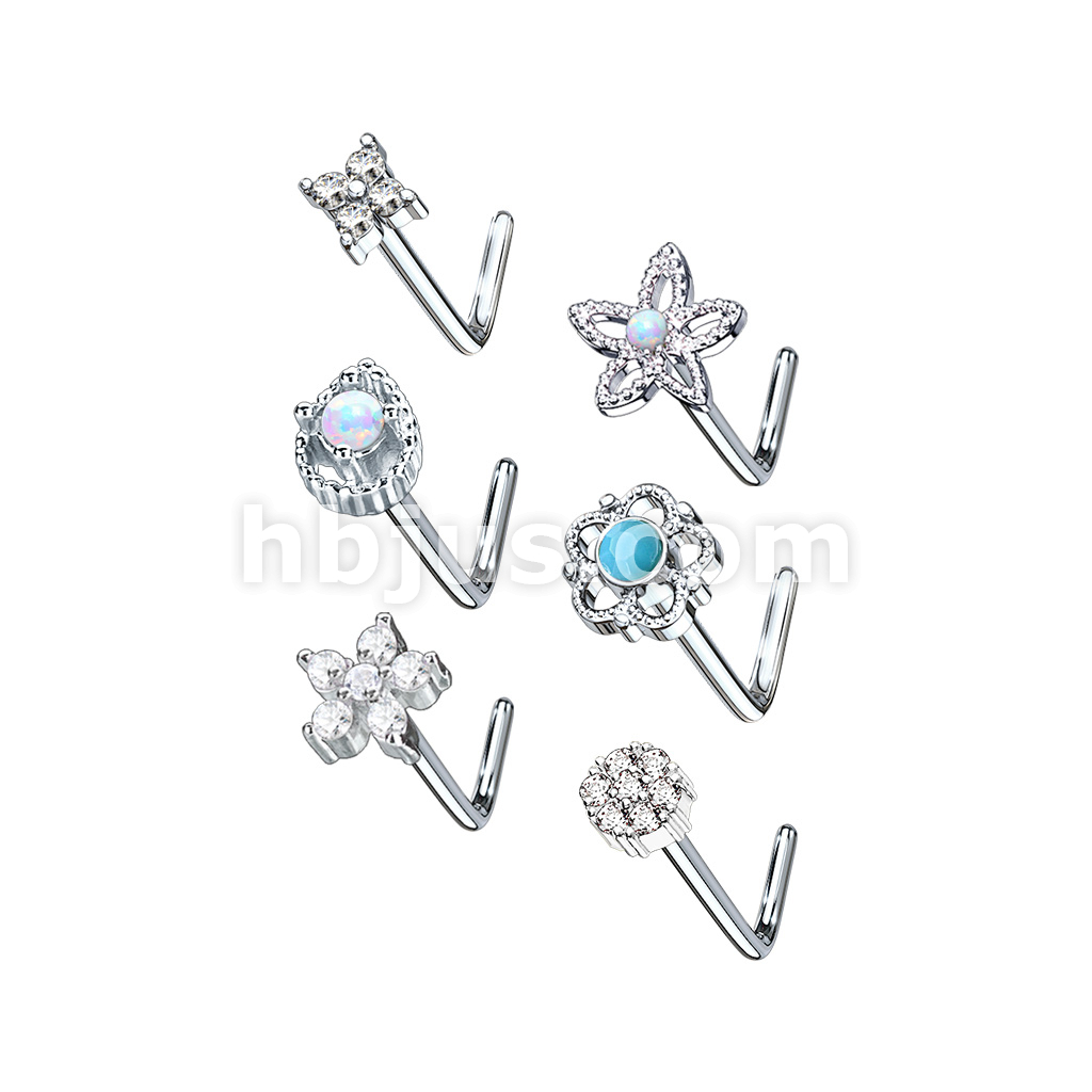 6 Pcs Pre Loaded Assorted L Bend 316L Surgical Steel Nose Stud Rings Gem Box Package