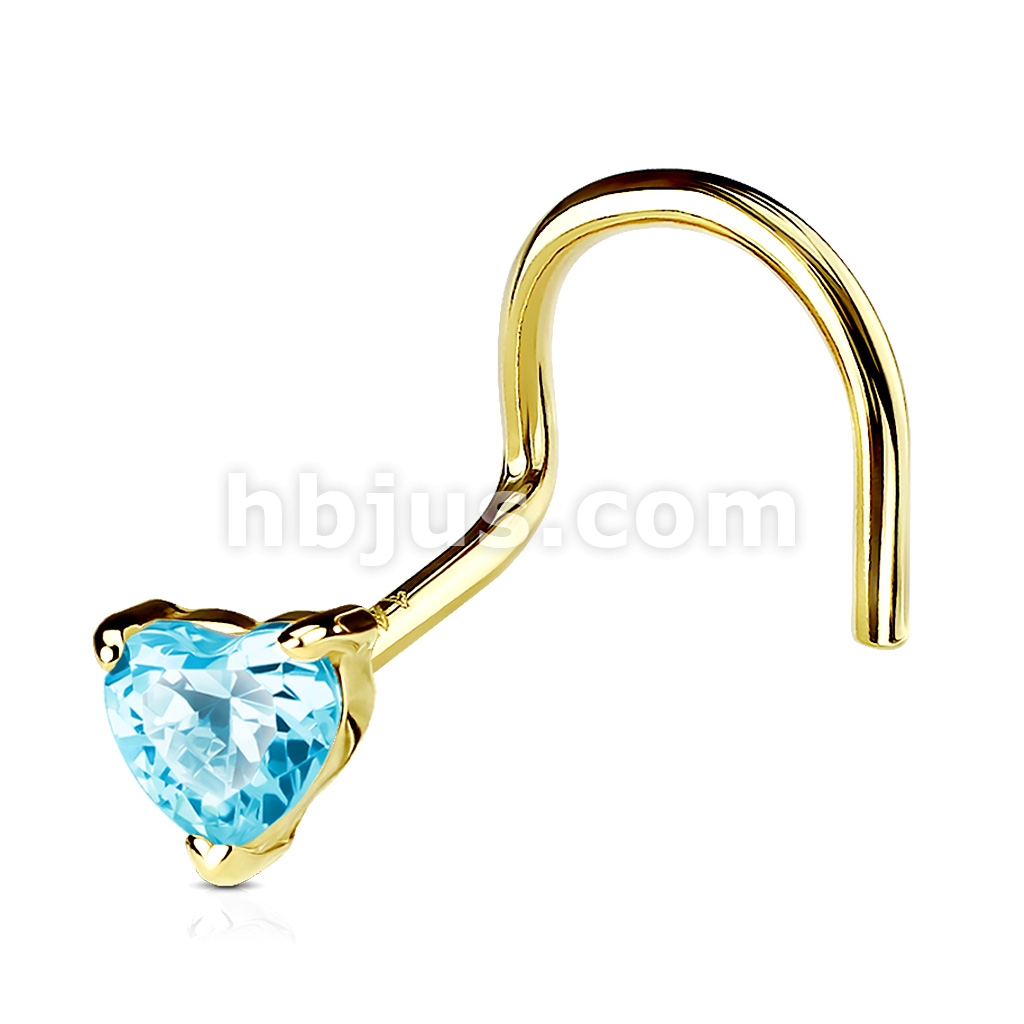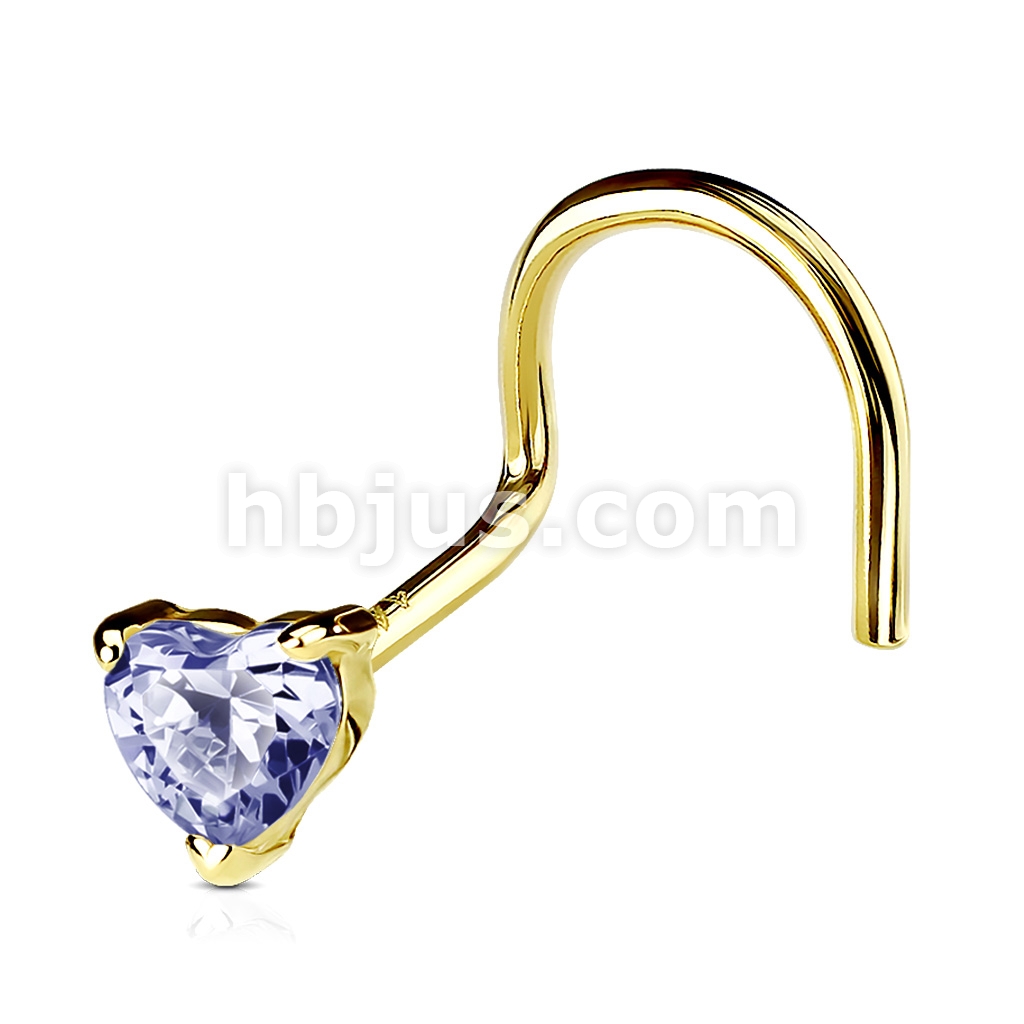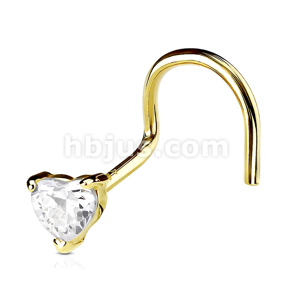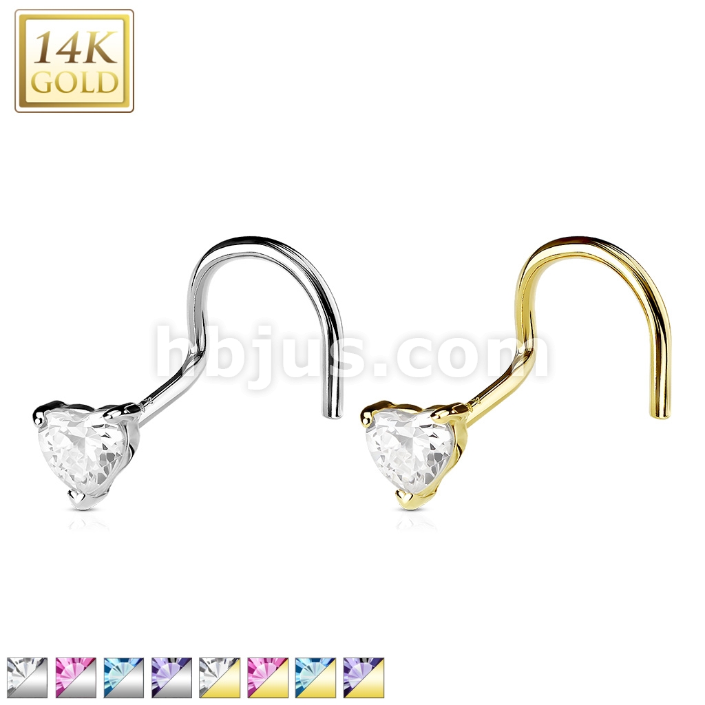 14K Solid Gold Heart Prong CZ Nose Screw Ring