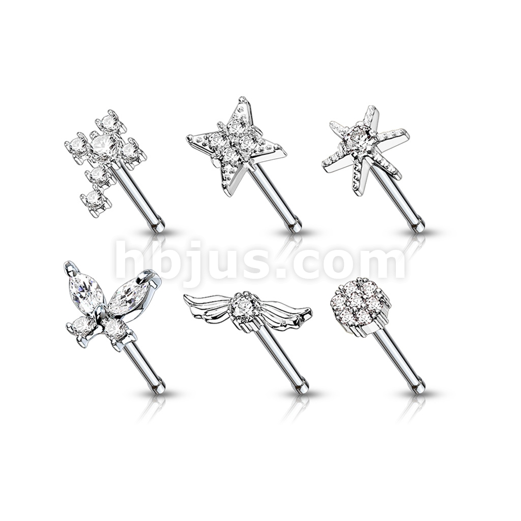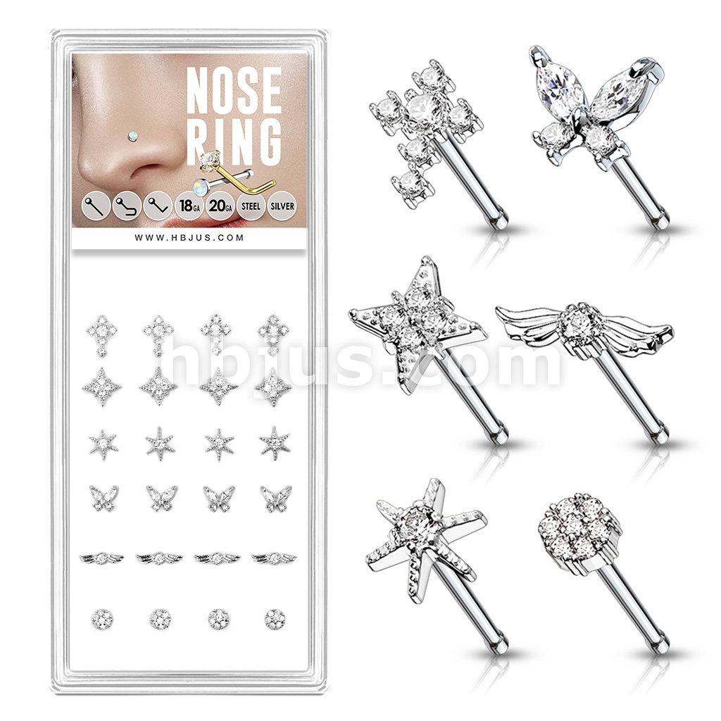 24 Pcs Pre Loaded Box of Mixed Styles with Clear CZ Top 20ga 316L Surgical Steel Nose Stud Rings Pack (6 Styles x 4 Pcs)
