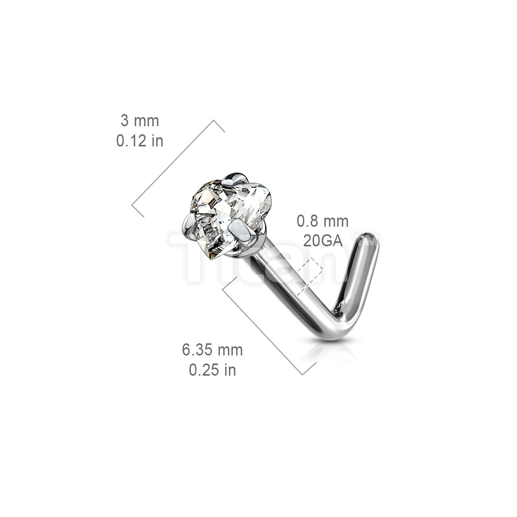 Implant Grade Titanium L Bend Nose Stud With Prong Set Heart CZ