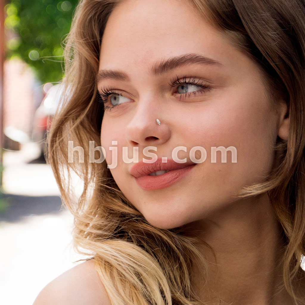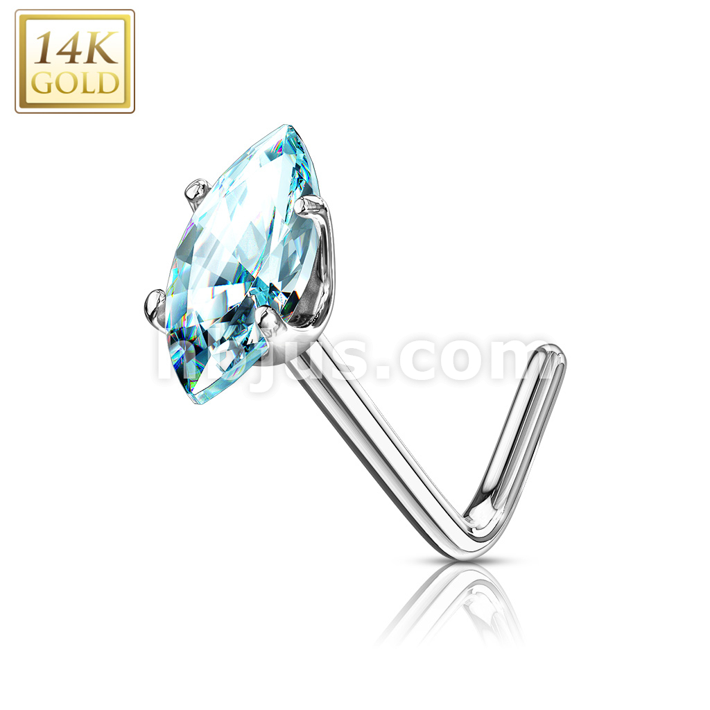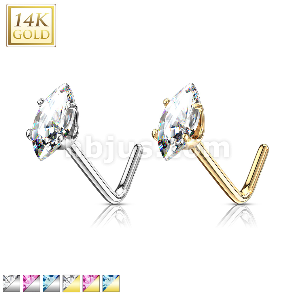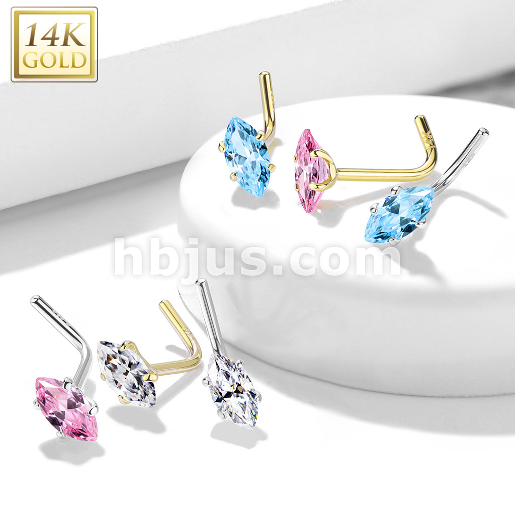 14 Kt. Gold L Bend Nose Stud Rings with Prong Set Marquise CZ