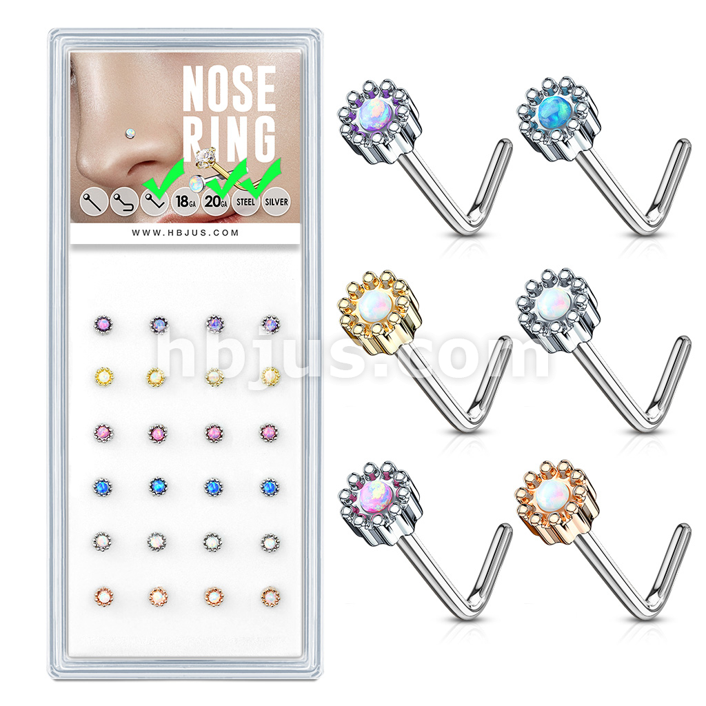 24 Pcs Opal Centered Round Top "L" Bend 20 Gauge 316L Surgical Steel Nose Bone Package