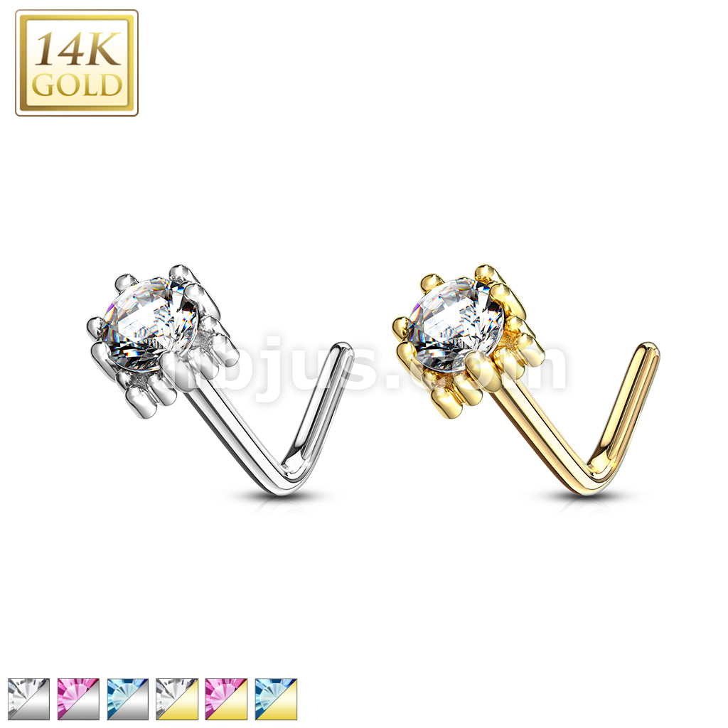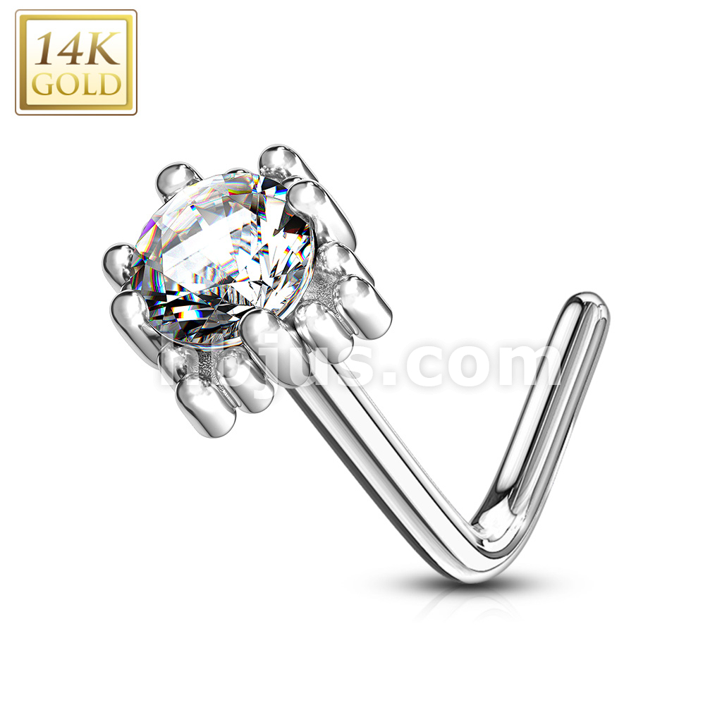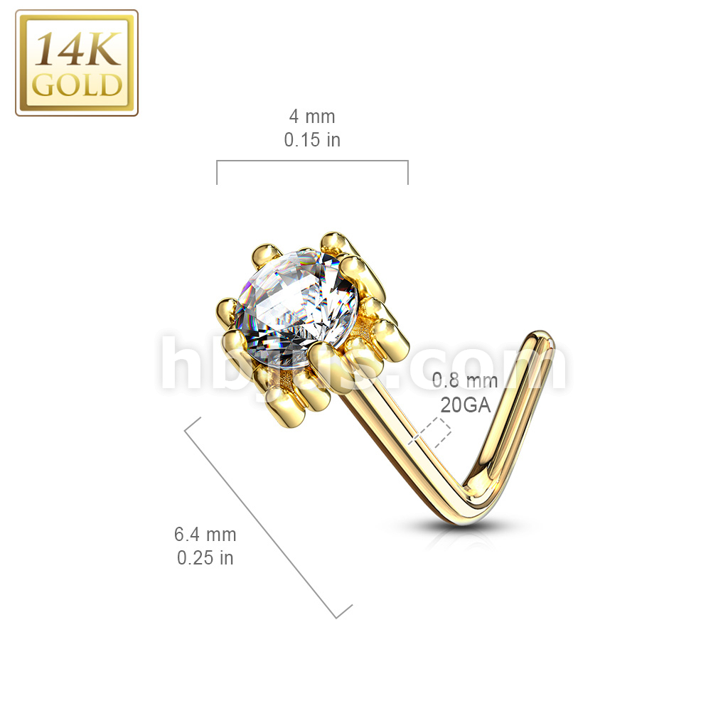14K Gold L Bend Nose Ring with Prong Set CZ Centered Four Point Star