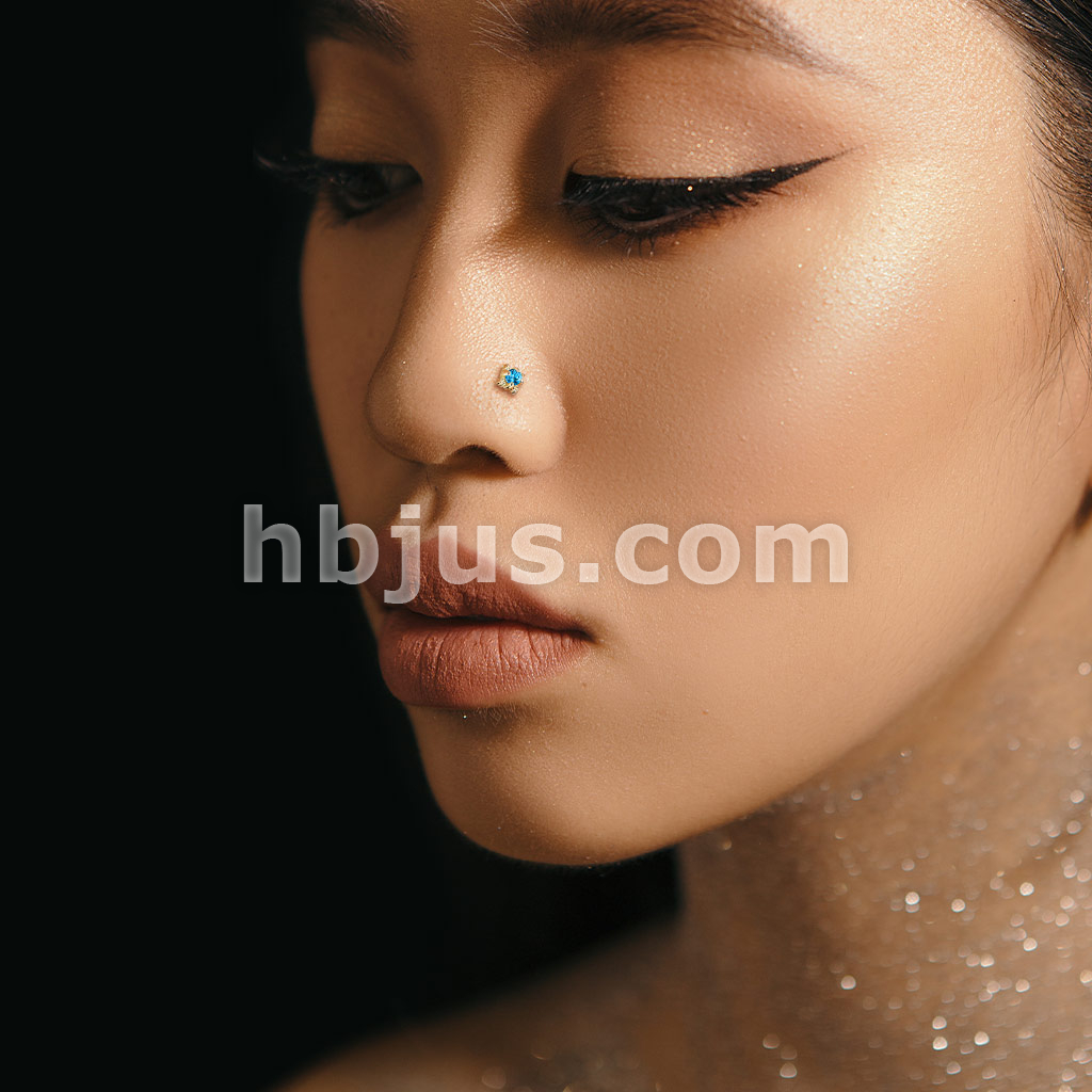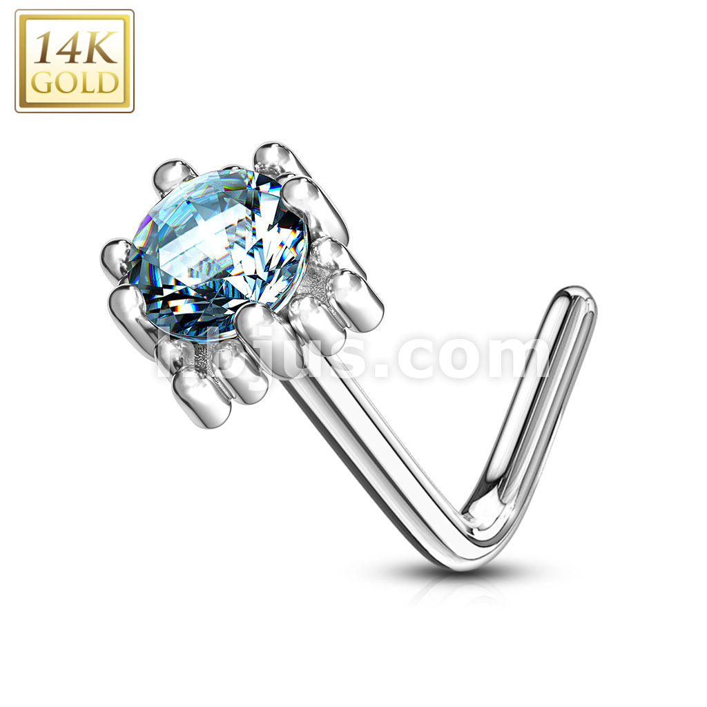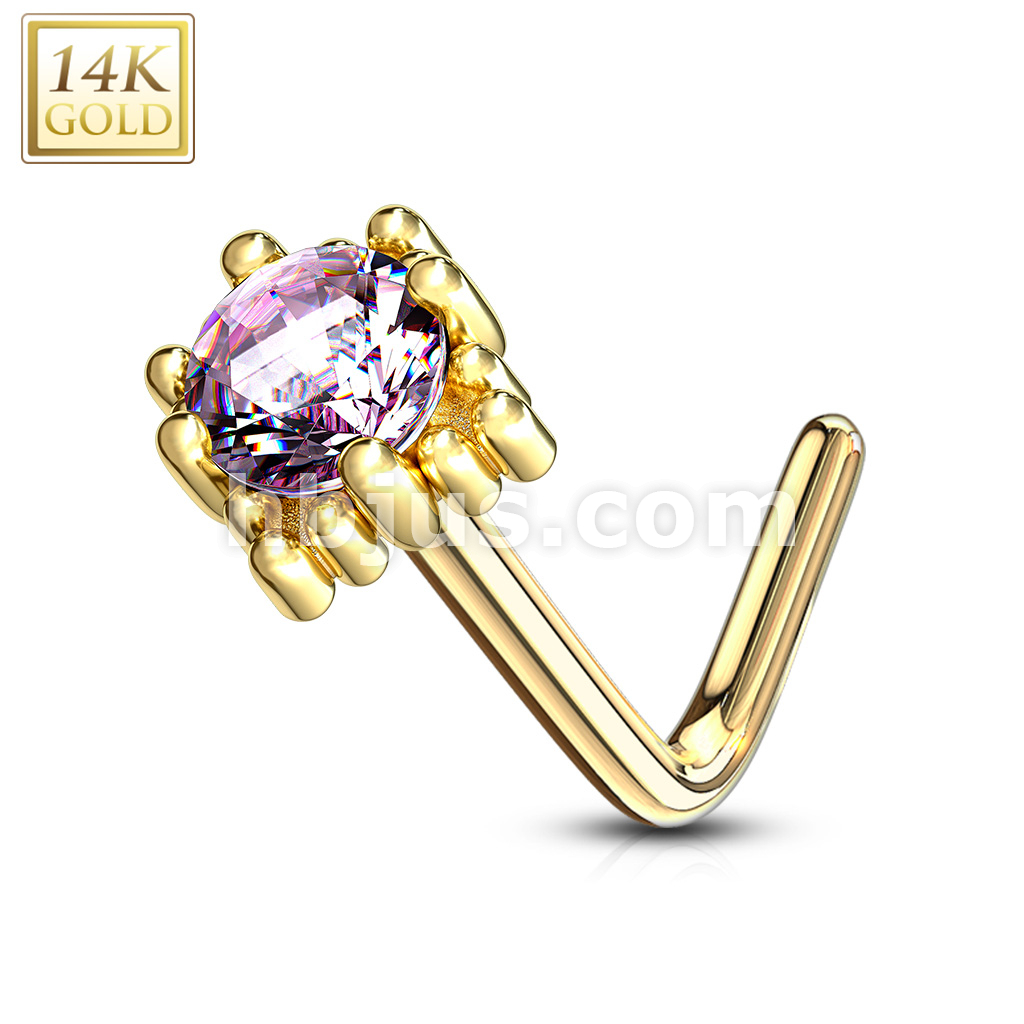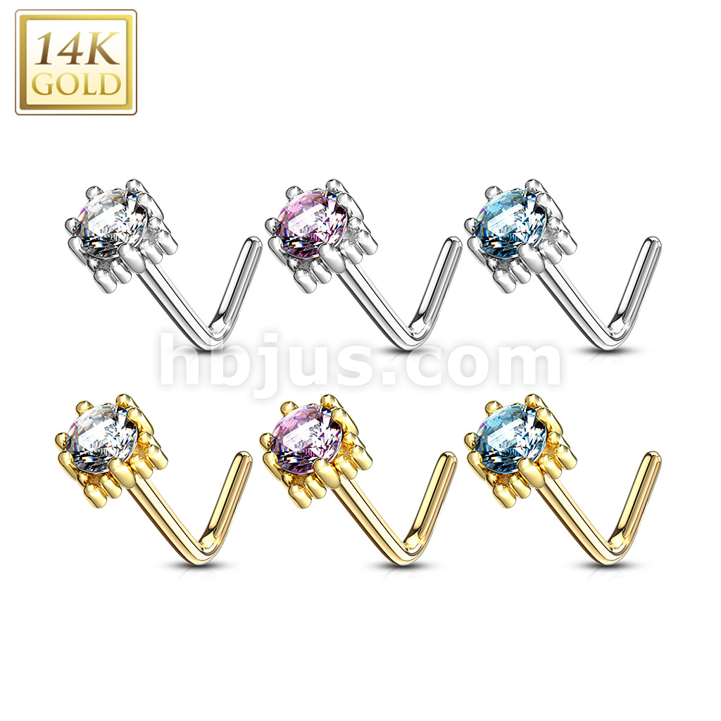 14K Gold L Bend Nose Ring with Prong Set CZ Centered Four Point Star