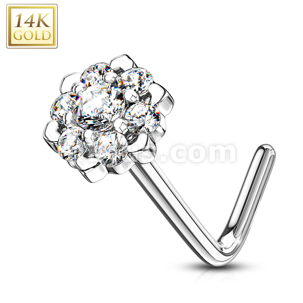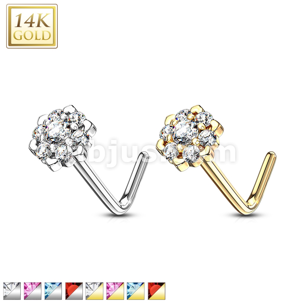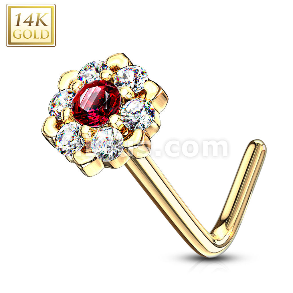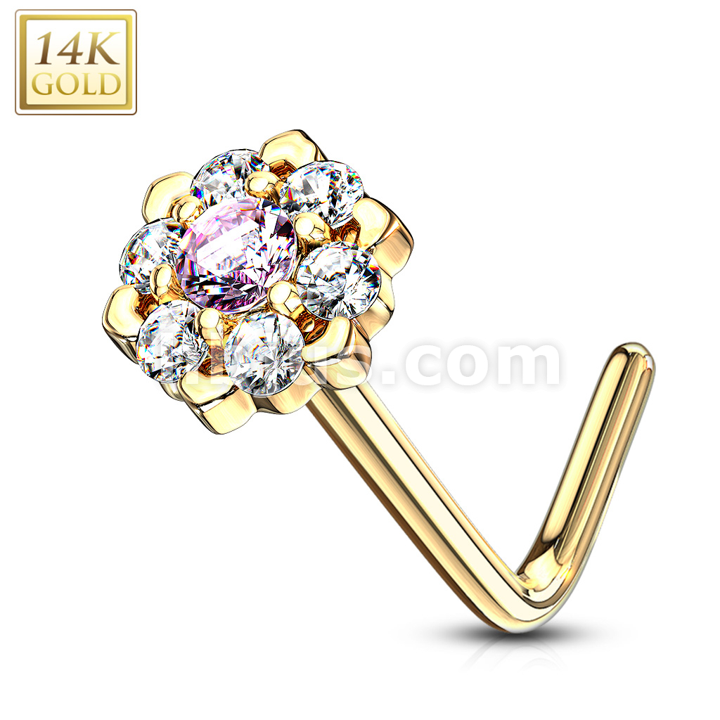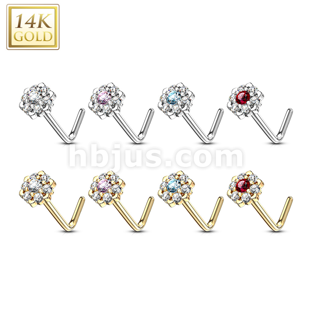 14Kt. Gold L Bend Nose Ring with Prong Set CZ Centered Gem Paved Outter Circle 6 Point Flower