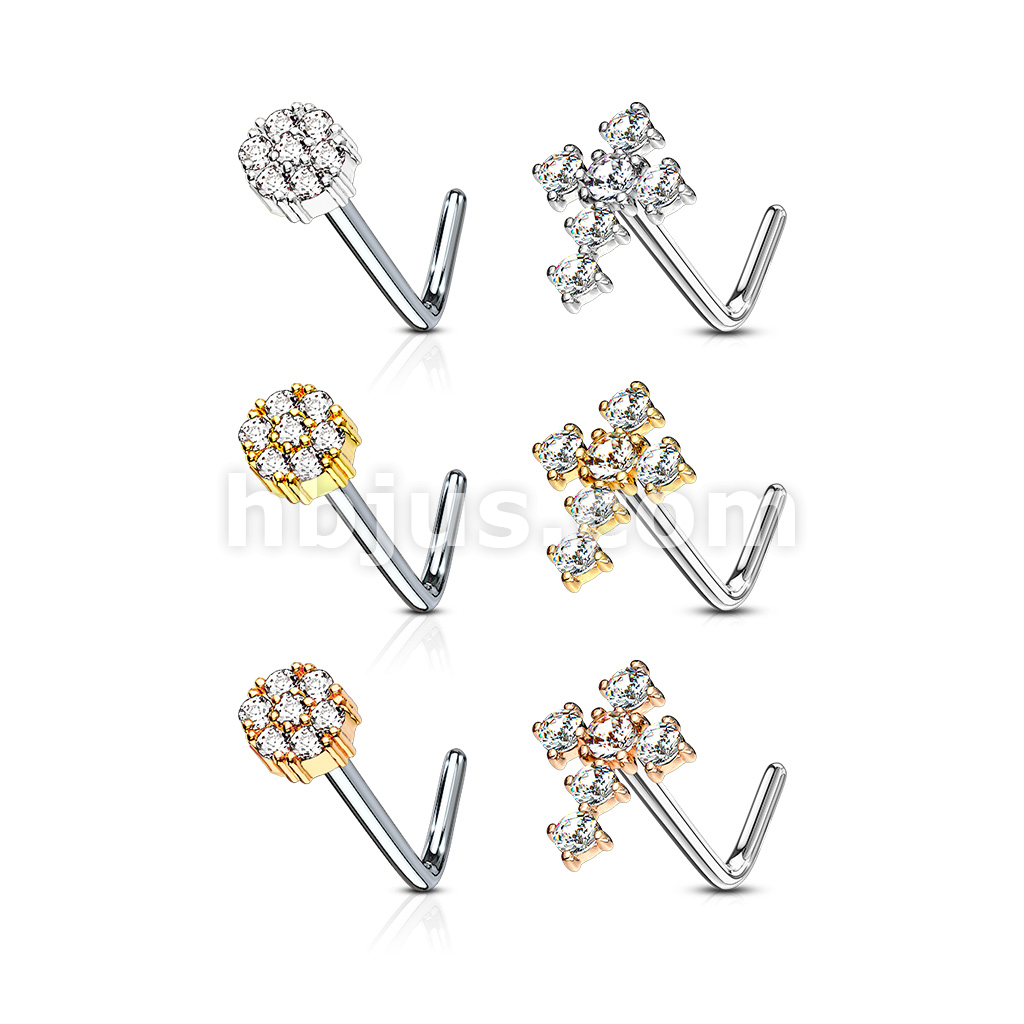 6 pcs Pre Loaded Gem Box Value Pack CZ Paved Small Flower and Cross 316L surgical Steel L Bend Nose Stud Rings