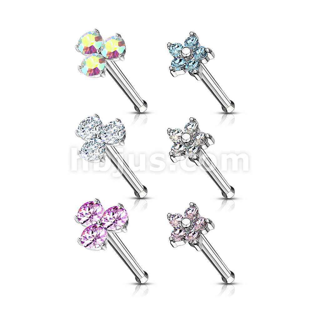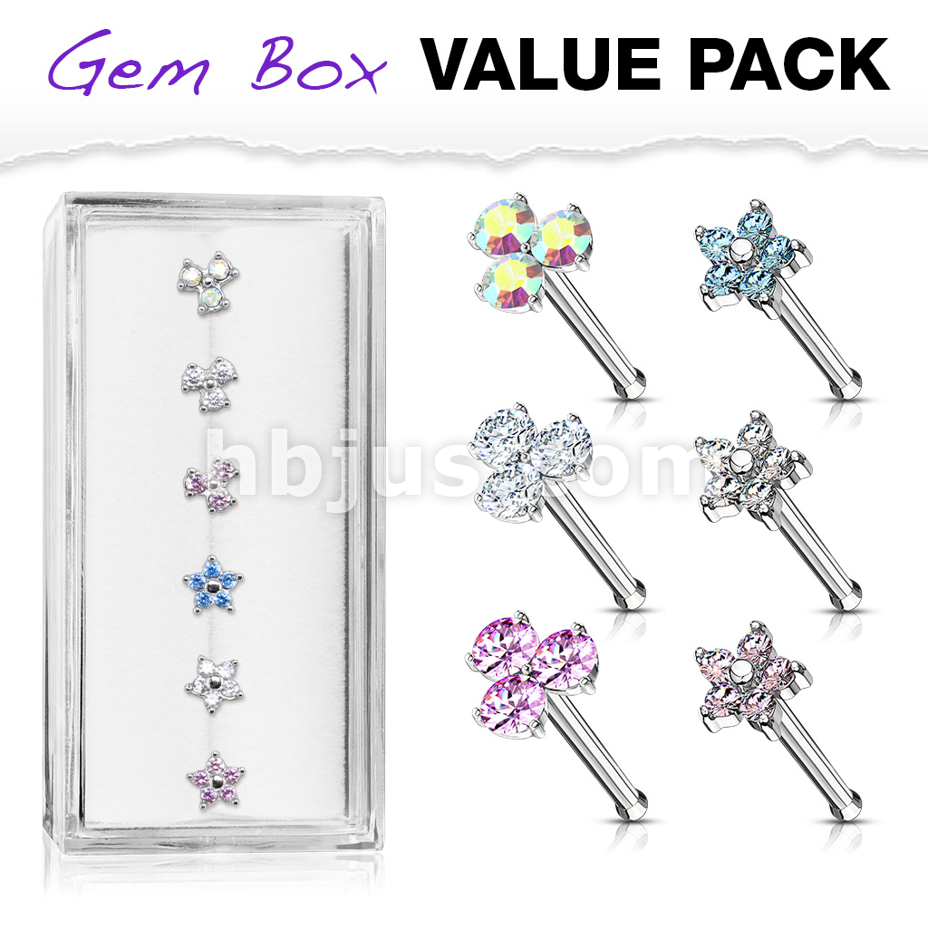 6 Pcs of Three Prong Set Round CZ Triangle and Five CZ Flower Top 316L Surgical Steel 20ga Nose Stud Rings Gem Box Package