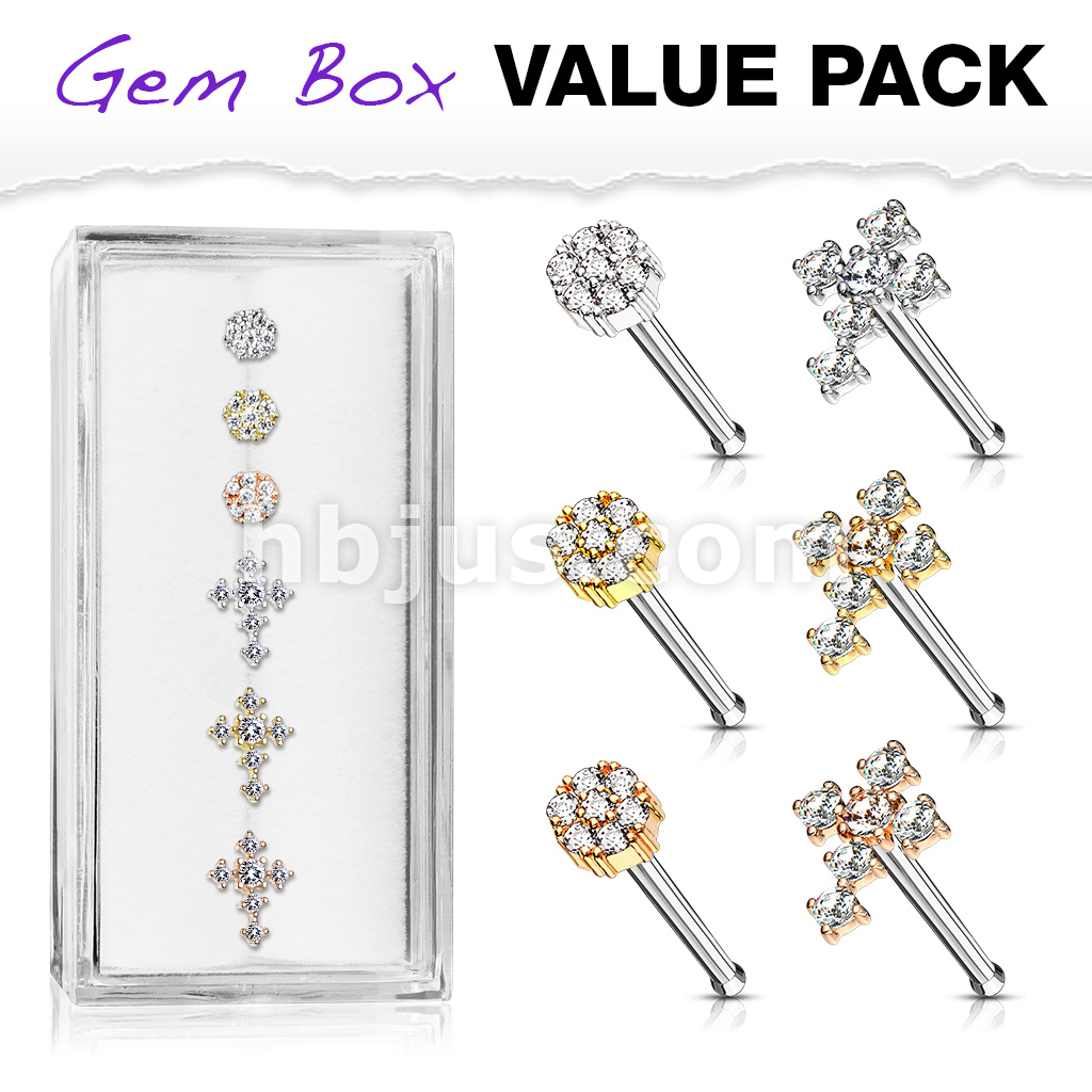 6 Pcs of CZ Cross and CZ Flower with Double Tiered CZ Center Top 316L Surgical Steel 20 Gauge Nose Stud Rings Gem Box Package