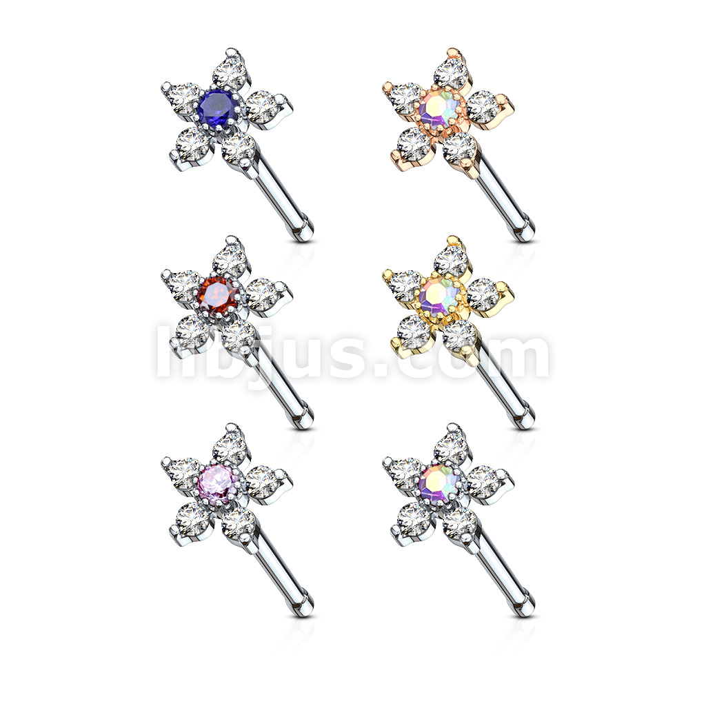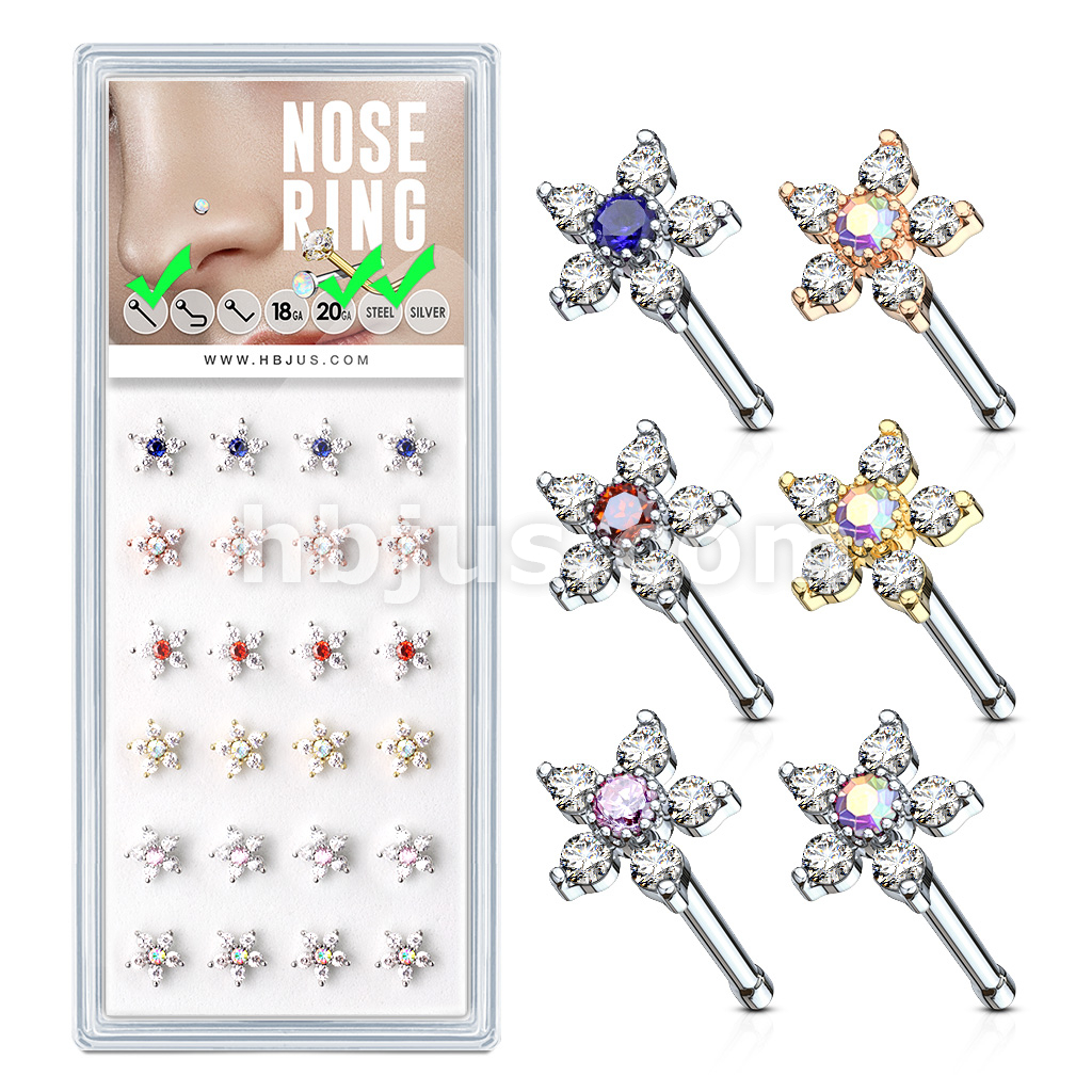 24 Pcs Pre Loaded Box of 6 CZ Flowers 20 Gauge 316L Surgical Steel Nose Stud Rings Pack (6 Colors x 4 Pcs)