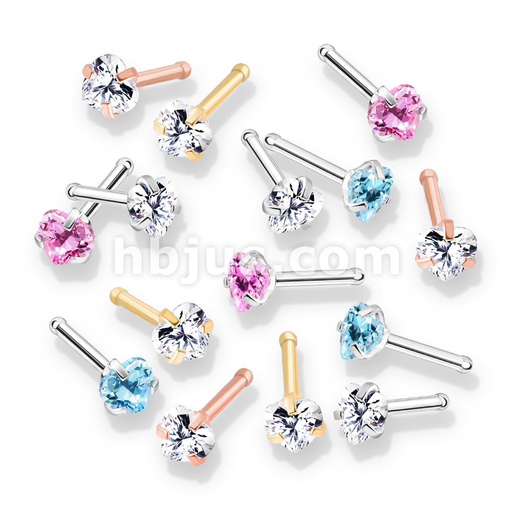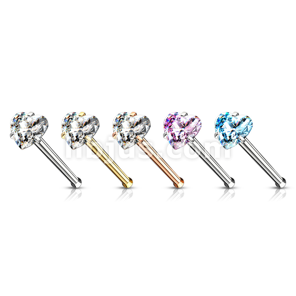 100 Pcs Prong Set Heart CZ Top PVD over 316L Surgical Steel Nose Bone Stud Rings (20 Pcs x 5 Colors)