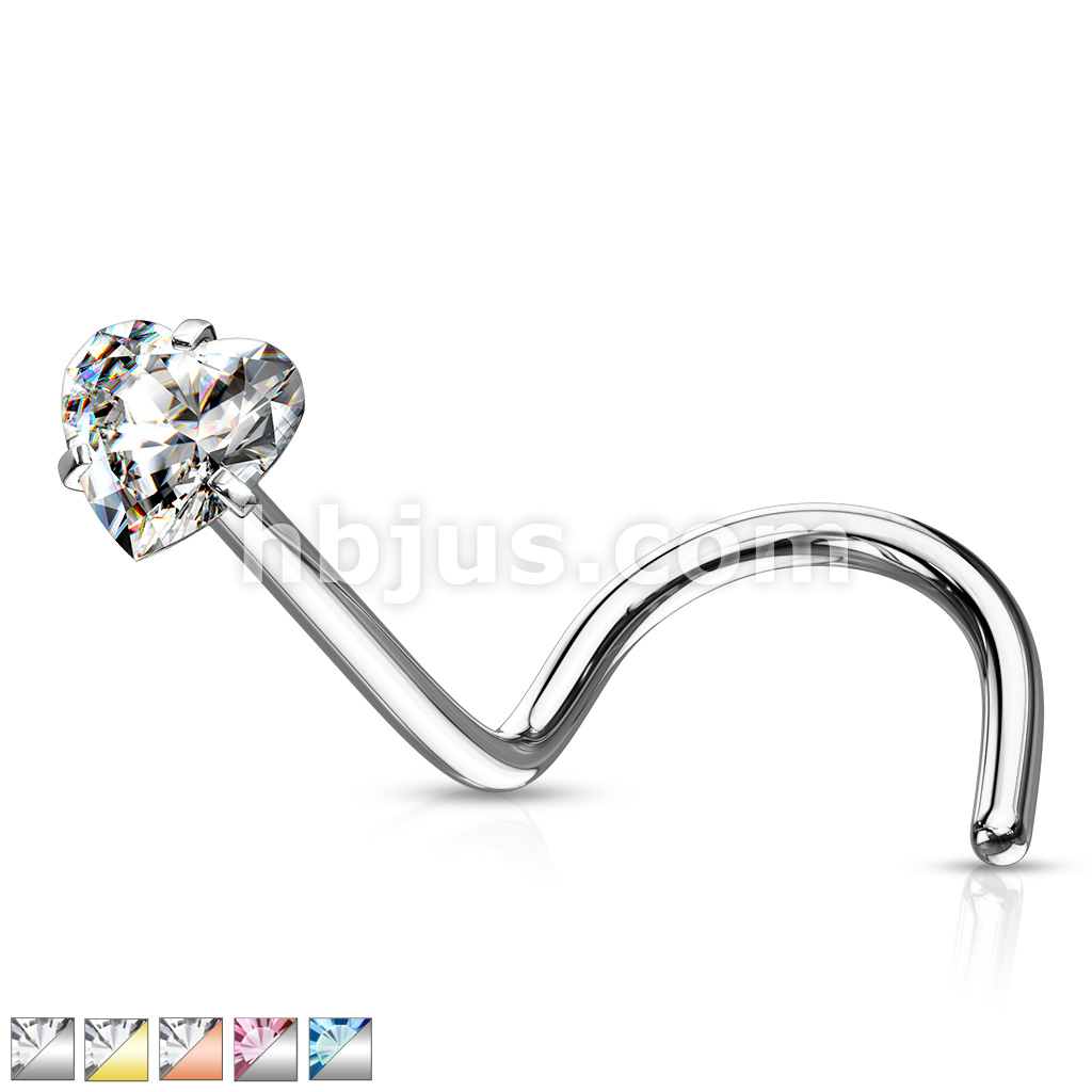 Prong Set Heart CZ Top 316L Surgical Steel Nose Screw Rings