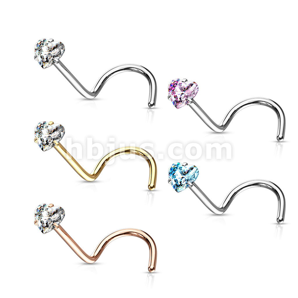 100 Pcs Prong Set Heart CZ Top PVD over 316L Surgical Steel Nose Screw Rings (20 Pcs x 5 Colors)