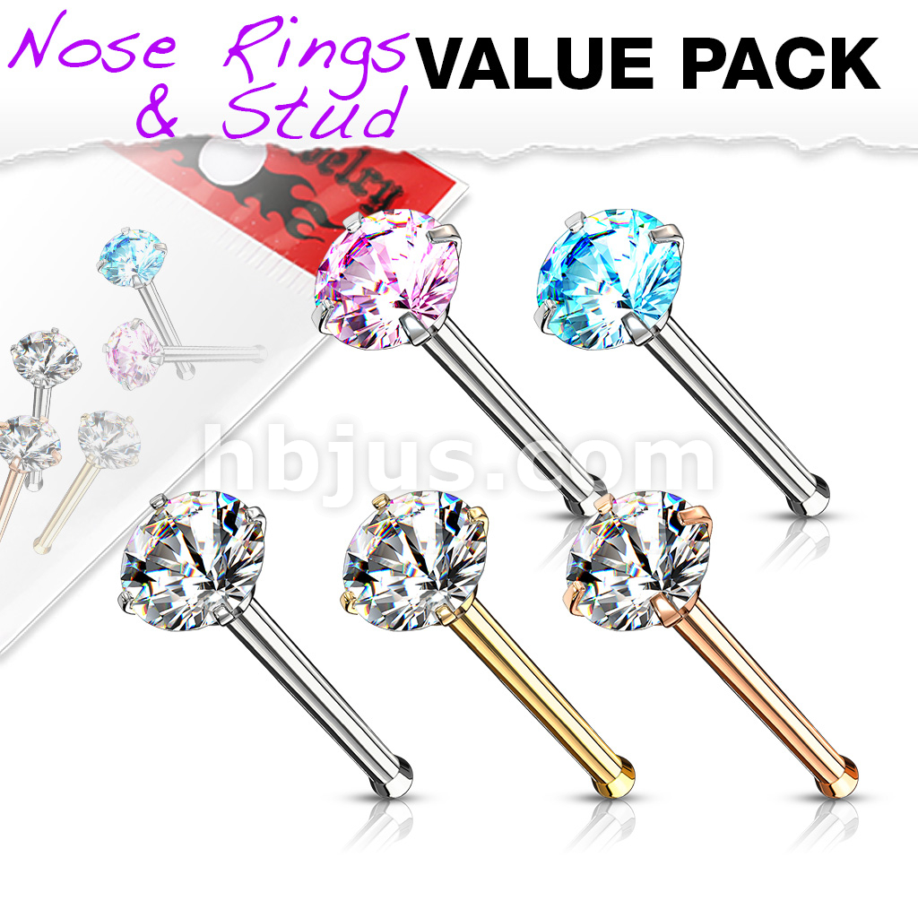 5 Pcs Value Pack of Assorted 316L Surgical Steel Nose Bone Stud Rings with Prong Set CZ