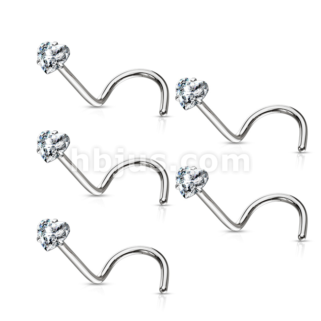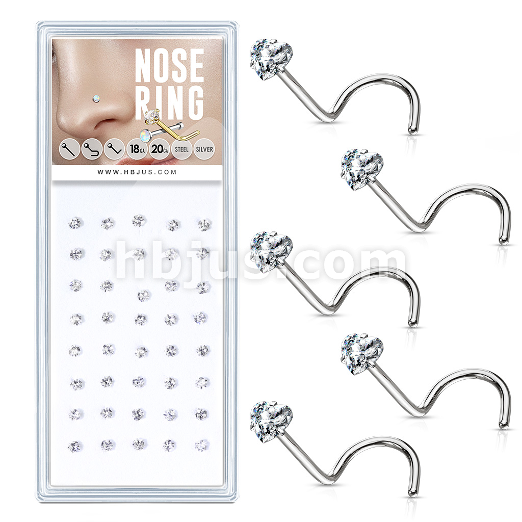 40 Pcs Pre Loaded Box of Prong Set Heart CZ Top 316L Surgical Steel Nose Screw Pack