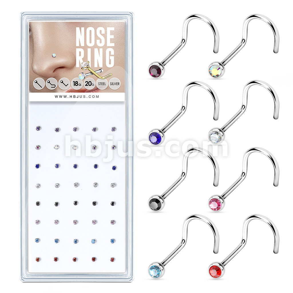 40 Pcs Mixed Colored Pre Loaded Box of Bezel Set CZ Top 316L Surgical Steel Nose Screw Pack